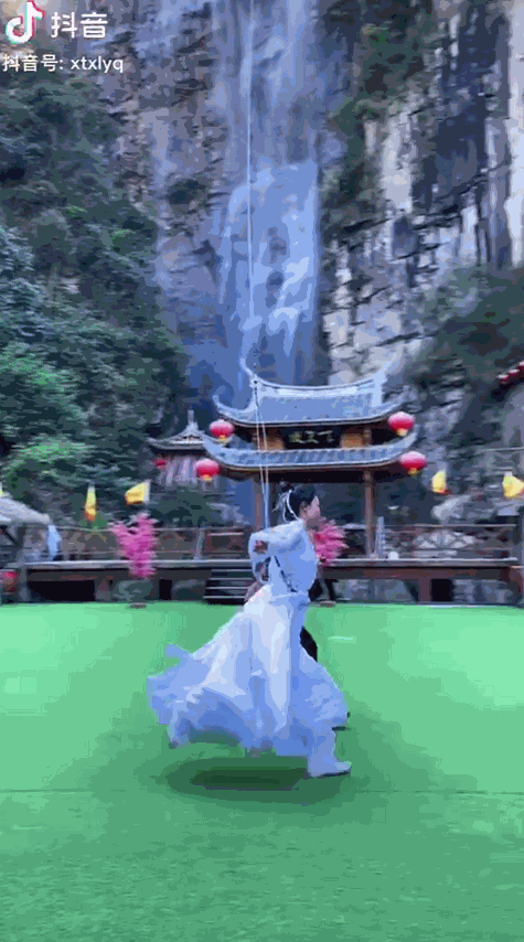 侠天下景区最网红的设施,就是这里的威亚项目。每天都会有很多小姐姐穿着汉服,在这里的山石之间闪转腾挪。景区特别选择了瀑布作为威亚项目的背景,远看正如在渡劫的修仙道友,充满了仙灵的武侠风味,在一圆大家武侠梦的同时,也引来了下方围观游客的阵阵惊呼。