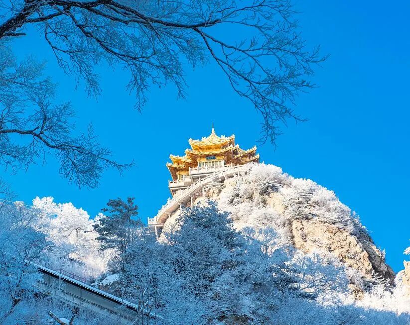 雪季,老君山上的景色着实令人惊艳。此时的老君山,银装素裹,从地面到森林再到建筑,都被无限的白雪覆盖。