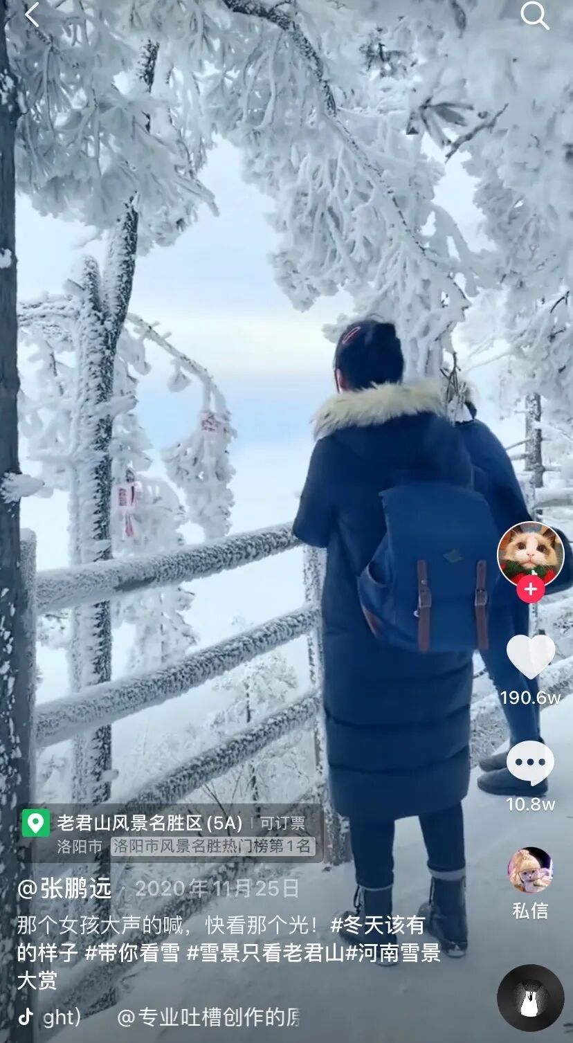 在被抖音上的旅行家们发现以后,老君山的冬日美景很快吸引了更多人的注意力。人们纷至沓来,为的是亲眼见证曾经只在手机屏幕里见过的雪景、雾凇和金顶上的落日。一度只在道教信徒圈子和洛阳旅游圈有名的老君山,就此成为了全国性的冬季重要景点。