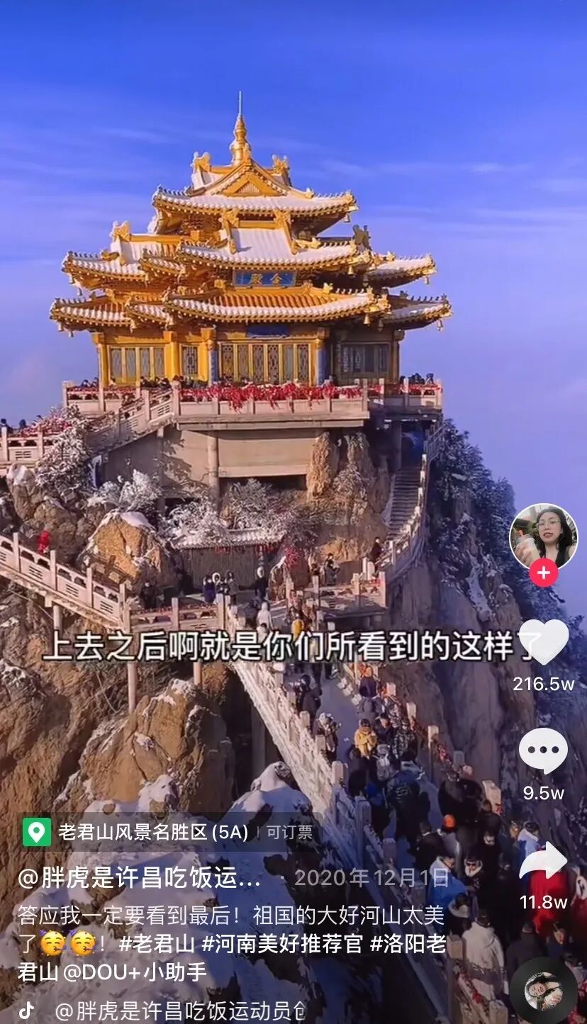 在抖音上,12月老君山搜索量据老君山文旅集团副总经理潘苗介绍,往年这个时候老君山每天接待约游客仅1000~2000人,今年冬季暴涨到七八千人左右,休息日更是常常上万,已达到景区的最大承载量。