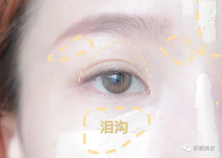 (图片中黄色虚线区域)使用偏橘色的遮瑕液体/膏进行涂抹(根据泪沟或是其他凹陷处的阴影部分形状。)少量多次。