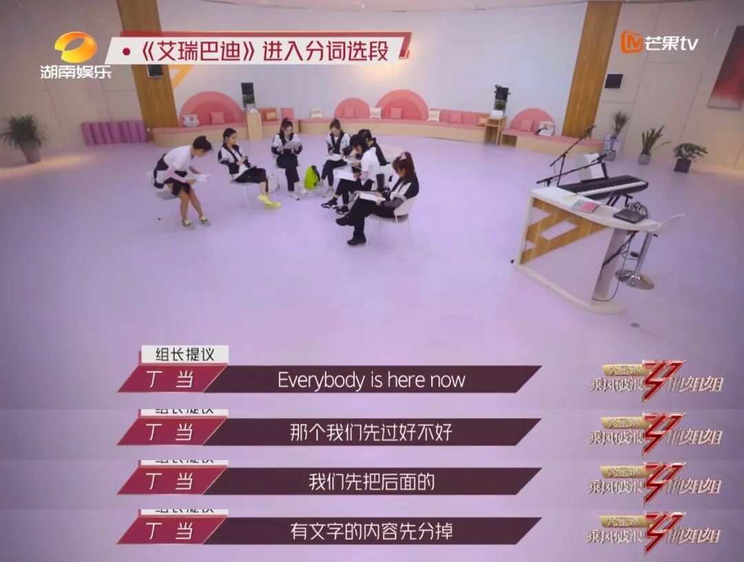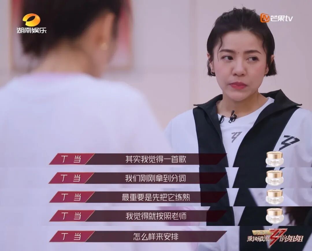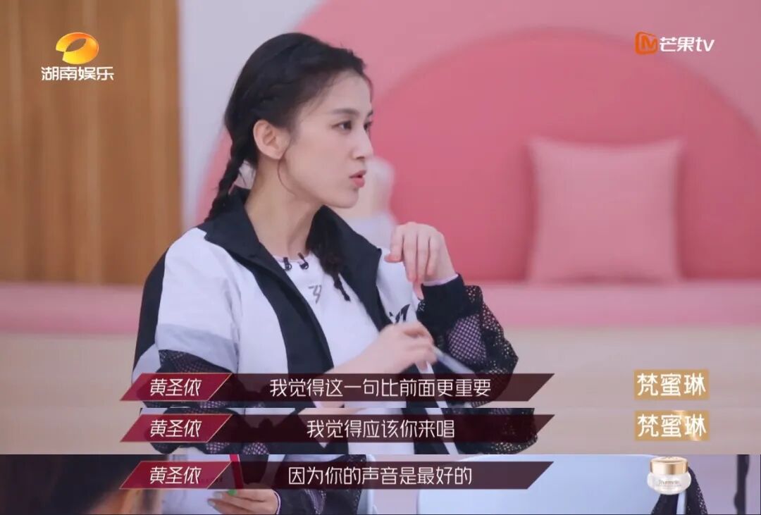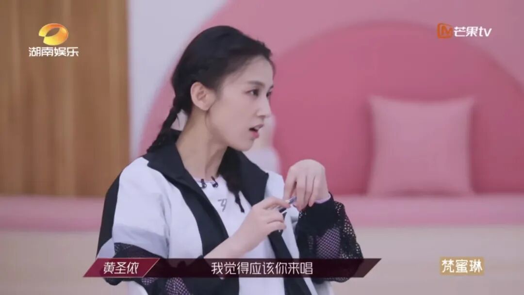 但旁人看来还是观感不佳,为什么呢?与人相处,她没有“互动感”,无时不刻都在表达自己,却不曾给予她人回应,自然就显得高高在上不讨喜——第二期进了《艾瑞巴迪》的组,丁当是大家选出来的队长,理应承担分配歌词的任务,本来还在分着前面的部分,却屡遭黄圣依打断。一句话里两个“我觉得”,一个“我要”,重点还是在说“后面的词”,没有跟着队长的节奏走,重心也一直只放在表达自己上。黄圣依像没有听到似的:我觉得这一句比前面的更重要。加上刘芸一直帮腔,其他姐姐们也没咋说话,氛围一度尴尬。黄圣依get不到,自顾自地唱起来了,非常老式的唱腔,显然不是团队要的。这一次刘芸还没来得及夸赞,虎大姐张雨绮就先说了:你怎么一直……(形容转音)。