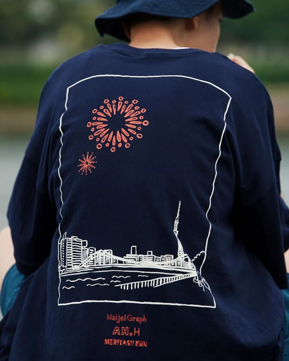 从《POPEYE》再到现在的AH.H,久米繊維一直是长谷川昭雄喜欢的品牌,所以AH.H联名企划中找上了久米繊維合作推出联名也是理所当然的。上回以隅田川烟花大会为背景的印花图案制作的联名Big Tee(7000日元)也是卖爆系列。