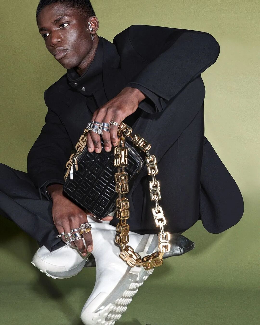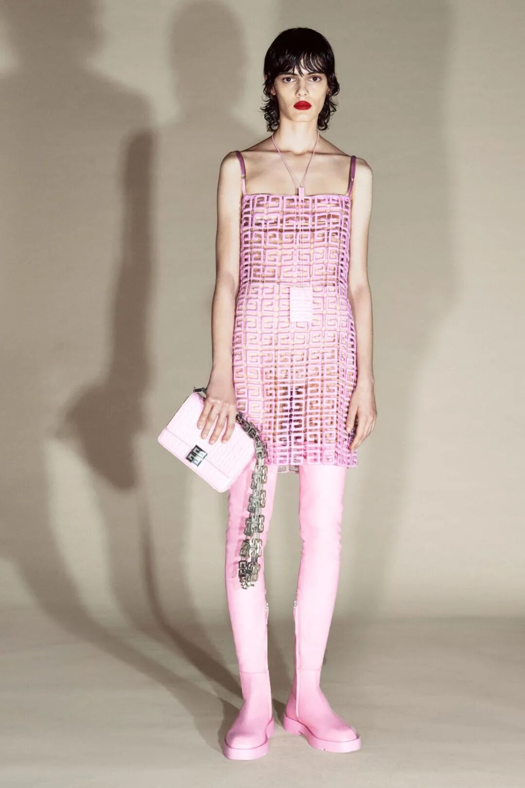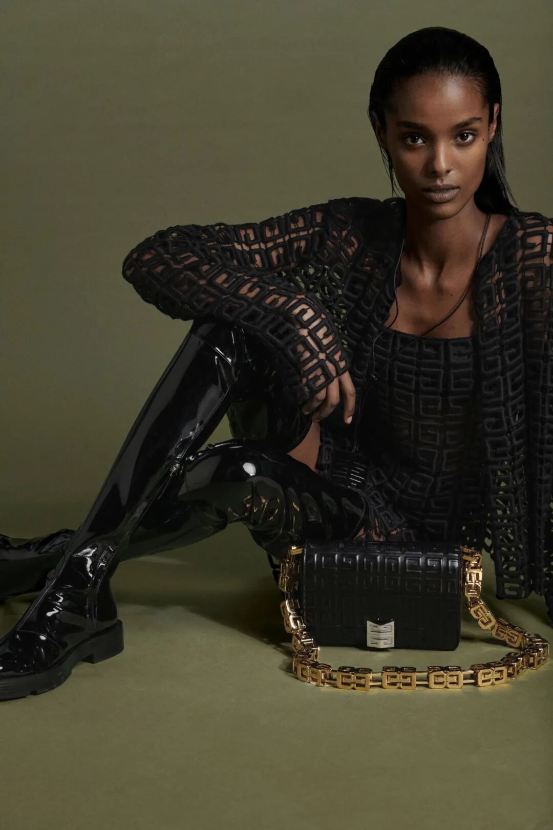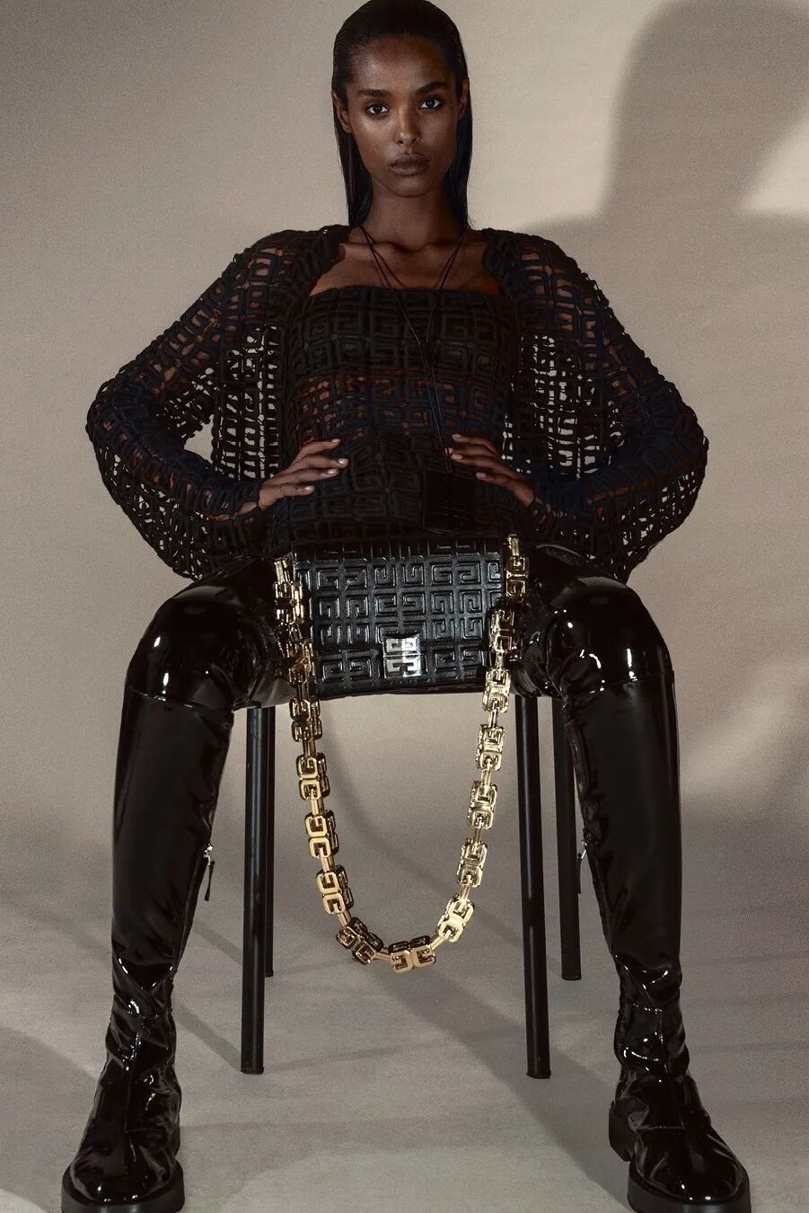 在最新系列中另一亮点,是GIVENCHY彰显品牌的「4G标志」以镂空的设计呈现。Z世代不是都对logo情有独钟吗?粉嫩的蕾丝连衣裙、黑色蕾丝针织外套和内搭logo紧身裙,让4G标志不张扬的存在感来诠释logomania风潮。除了在服饰上,GIVENCHY早也通过压纹工艺4G浮雕图案印上包袋,配上粗犷的链条肩带,能看出来上一季强势登场的锁链和4G标志依然是这一季的重头戏。还记得Matthew M. WILLIAMS刚入主GIVENCHY时就说过:「时尚必须反映出当今生活的意义。」因此「人穿衣而非衣穿人」这不只是他对GIVENCHY 2021早秋系列的理念,更是他对当今世界反映。