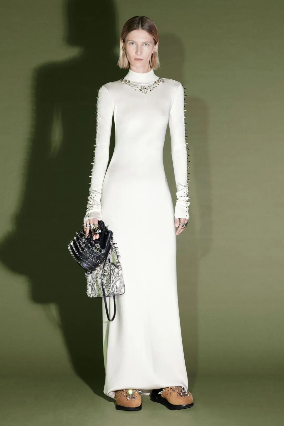超短棒球外套口袋的玩起了反转,西装领子直接融入了西装本身的创意结构;以及衬衫外套划出几何轮廓的前襟设计,MMW说,这样的服饰才是他平常会穿的。作为一个消费者,他会希望在买西装的时候,这个品牌能给他漂亮的衣服,而不只是将西服扣子全部扣起来。贴身的连衣裙勾勒出GIVENCHY的女装轮廓,足下的EVA底麂皮鞋又提升了运动元素,也体现了并存的理念:柔美与张狂。