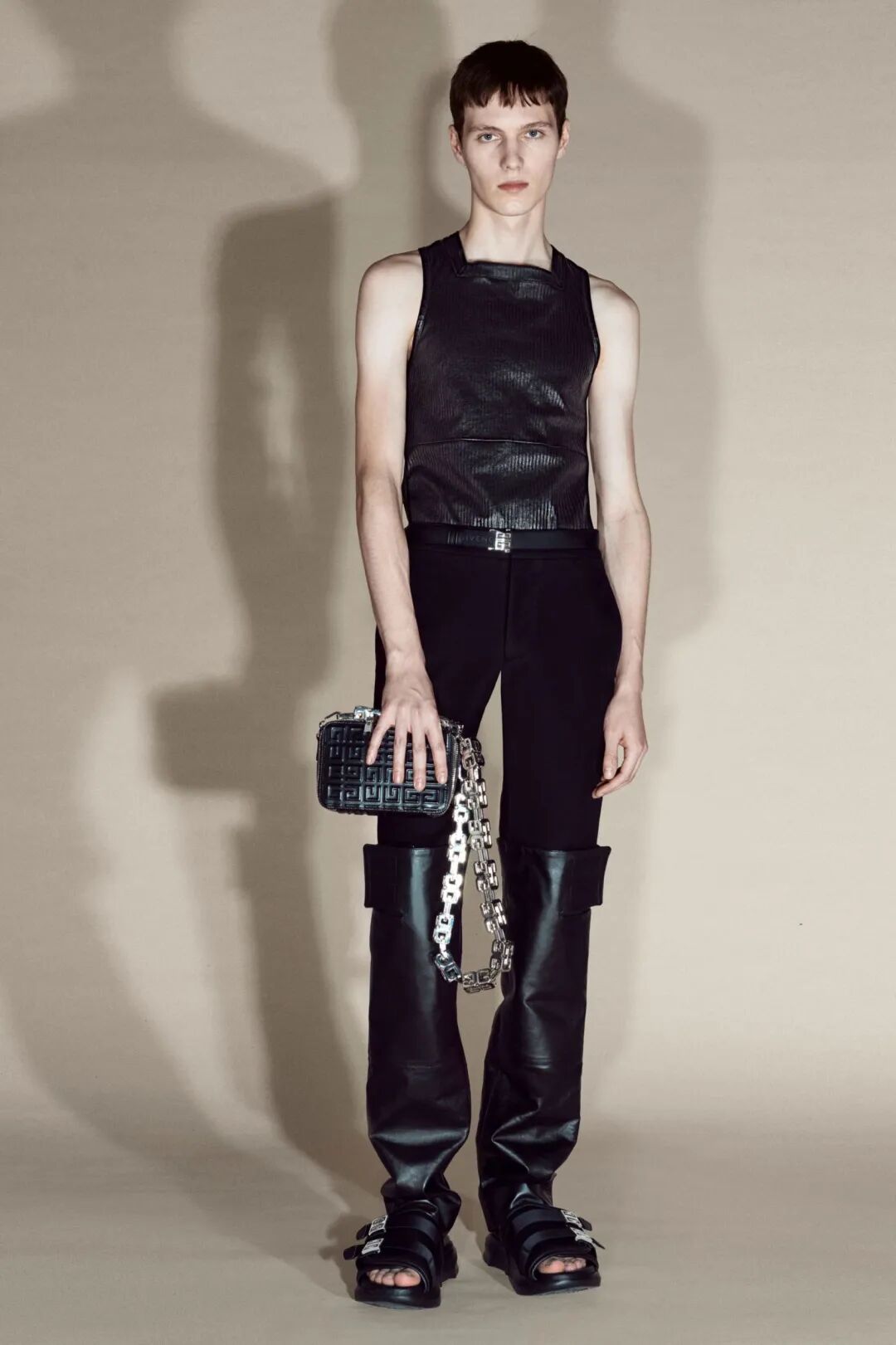 而问到Matthew M. WILLIAMS的创作灵感时,他直白坦言道自己在创作时,不太依靠视觉参考图像,因此也不会为每季系列制作情绪板。取而代之的是对材料的触摸和搜集灵感图像,更多的是凭直觉去创作。要知道情绪板对于设计师而言,在设计过程中有助于寻求设计的方向和打磨过程。Matthew这种“不那么严谨”的创作方式,源自于他非圣马丁出身,而是DONDA School毕业的背景。以多年在潮流圈的经验,将自己锻炼成摄影、音乐、时装设计、造型、平面艺术的全才,加上尚年轻的年纪与Z世代消费群体的联系,让他有着凭直觉去打造爆款的本能。有意思的还有这一季的铆钉拖鞋和人字拖。如今很难打动年轻人花大价钱去买一双已经缺乏时尚感的人字拖了,GIVENCHY另类趣味的人字拖半靴和装饰满铆钉的“刺猬”拖鞋,或许能够讨好Z世代的欢心。