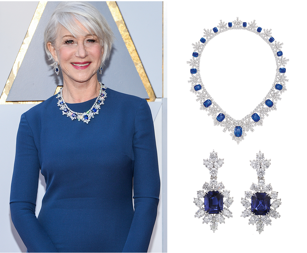 女王的扮演者英国女星海伦·米勒佩戴超过380万美元的蓝宝石钻石项链和配套耳环出席奥斯卡颁奖晚会,气质卓然高贵。