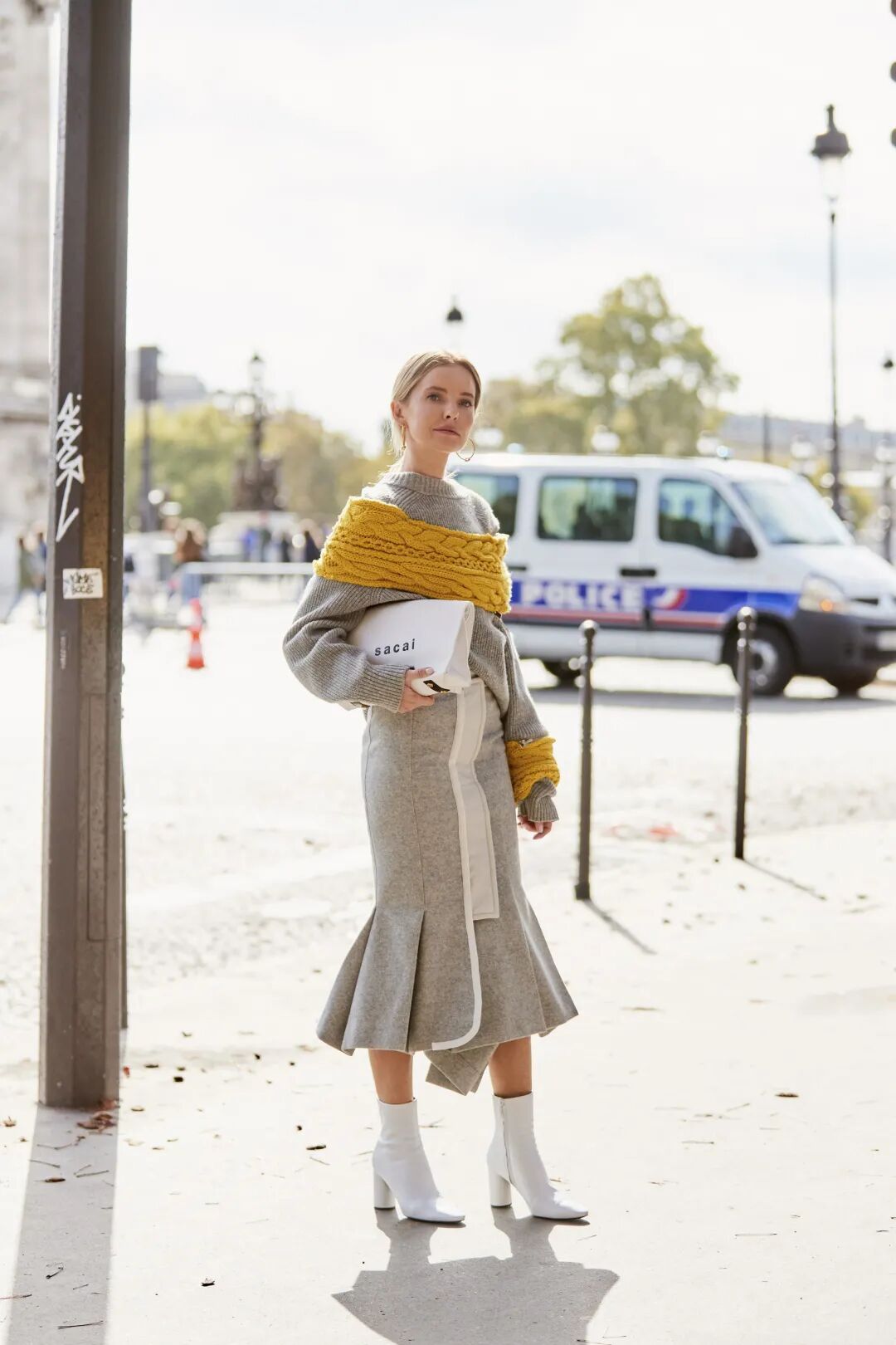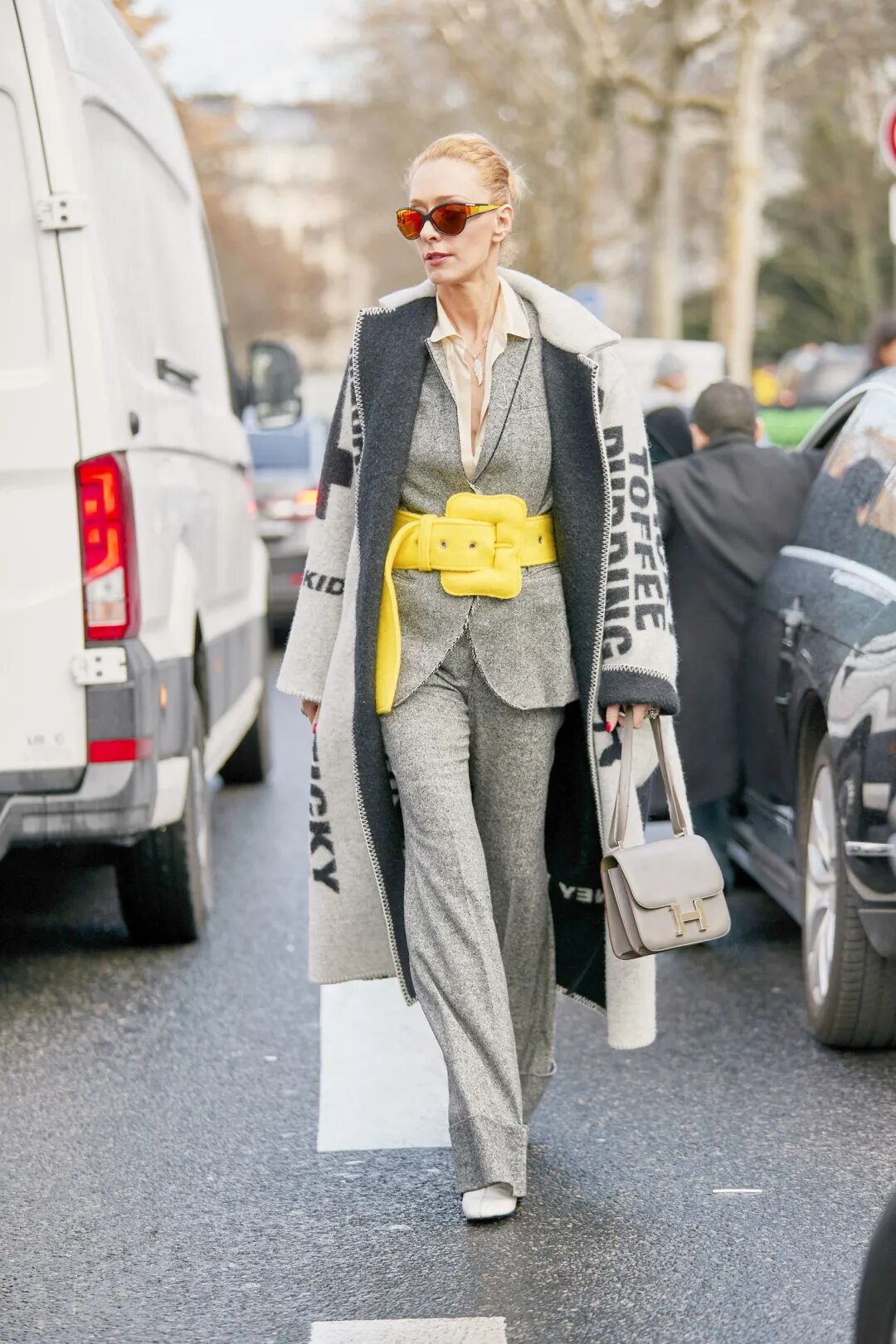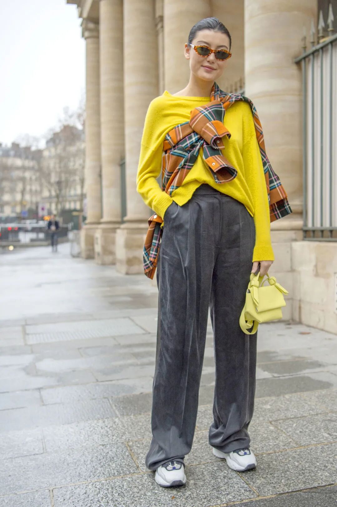 它和各种色彩都比较百搭,作为上装或者是下装穿都不会太挑人。它自带视觉放大的效果,所以上装显人高,下装显腿长。一年四季都适宜的组合是和经典的黑白色搭。如果是搭同样比较明亮的白色,那么穿在身上干干净净,在冬天里自带视觉温度。如果是搭配黑色,那么就是塑造了一种强烈的撞色效果,让身上的简单款式变得立体有型起来。黄色和蓝色也是经典CP,亮丽黄的时尚单品可以和各种牛仔蓝色的款式搭配,既有点复古街头的感觉,又很减龄。亮丽黄的优势就是它明明很抓眼球,但是又能穿得特别极简风。比如一眼看去很雍容华贵的毛毛外套,用了亮丽黄,就不会过分浮夸,反而很显年轻。所以用这种颜色的服装款式就算廓形上夸张些,设计上更大胆一些也能让更多人可驾驭。亮丽黄的配饰也很值得入一只,它不仅是单单拎出来吸引眼球,而且可以作为点缀出现丰富整体。比如亮丽黄围巾,就很能提升精气神。亮丽黄的包和鞋,搭配中性色的其他款式也能让普通的造型变得时髦度翻倍。这种灰色,不会太深沉,也不会太浓郁,他就像是一个绅士的色彩,给人感觉坚定可靠。据说极致灰是海滩上石子与大自然基本元素的颜色,因为经历风霜,所以象征着经得起时间考验的耐力、镇静、稳定与韧性。也许这也是为什么浅灰色总是能在时尚界拥有坚不可摧地位的原因,特别是现在人人都热爱中性风,一件灰色单品可以说是必不可少。