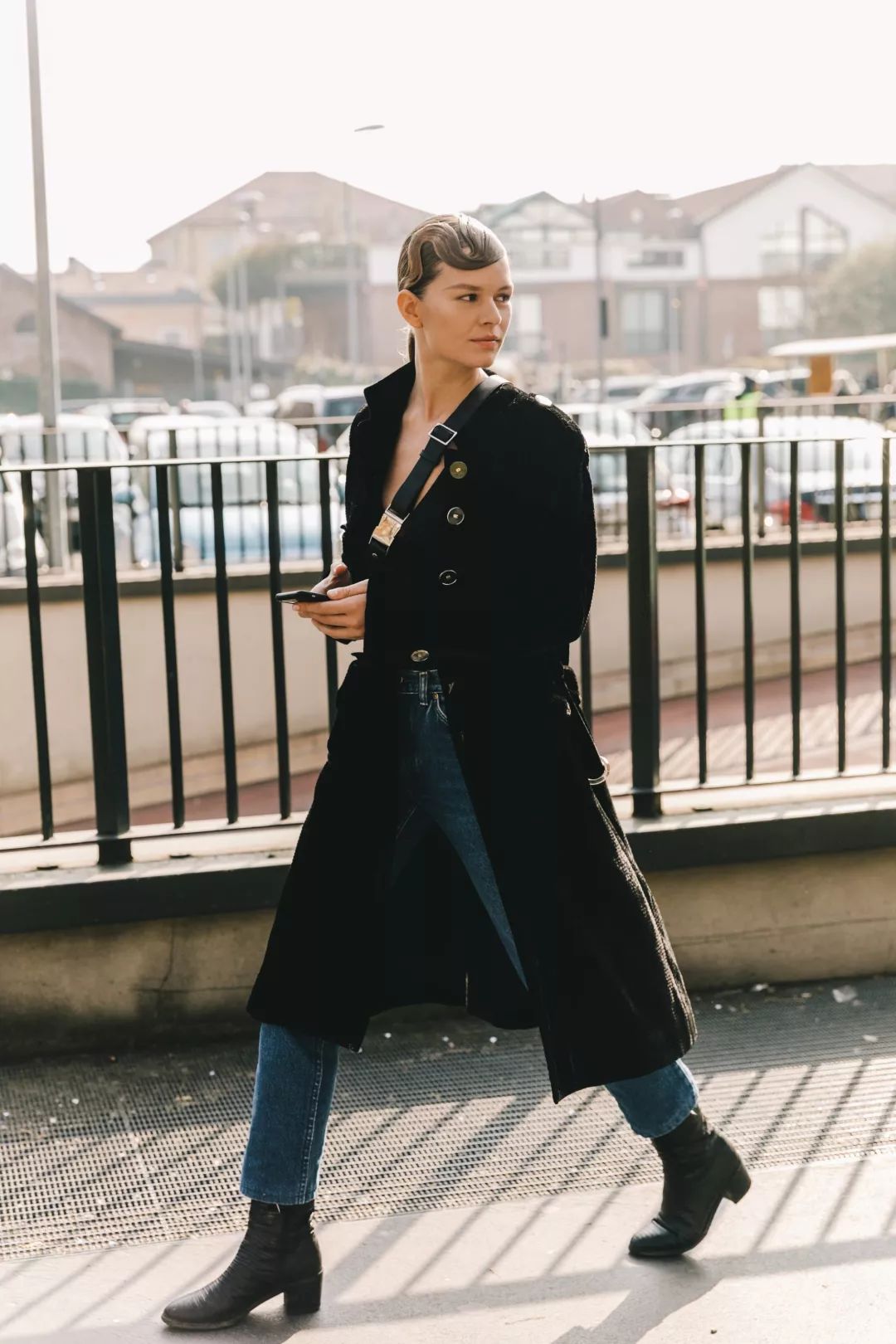黑色大衣混搭日常牛仔裤,加双黑色方头短靴,get日常通勤范儿!知性显随性!
