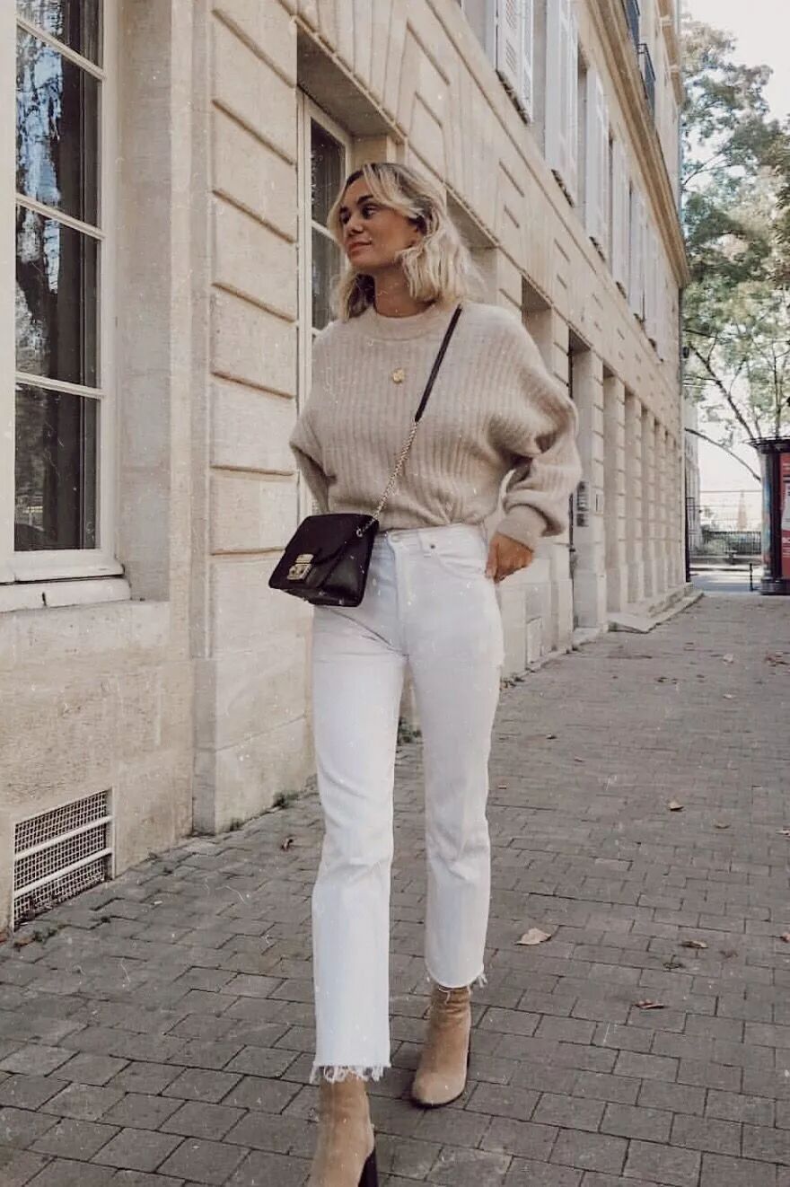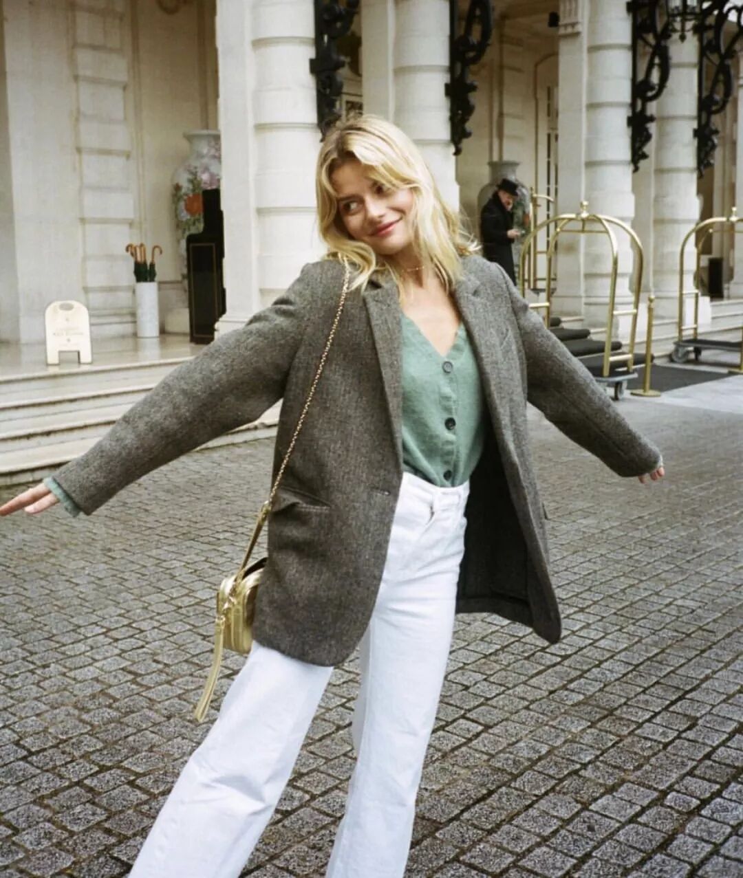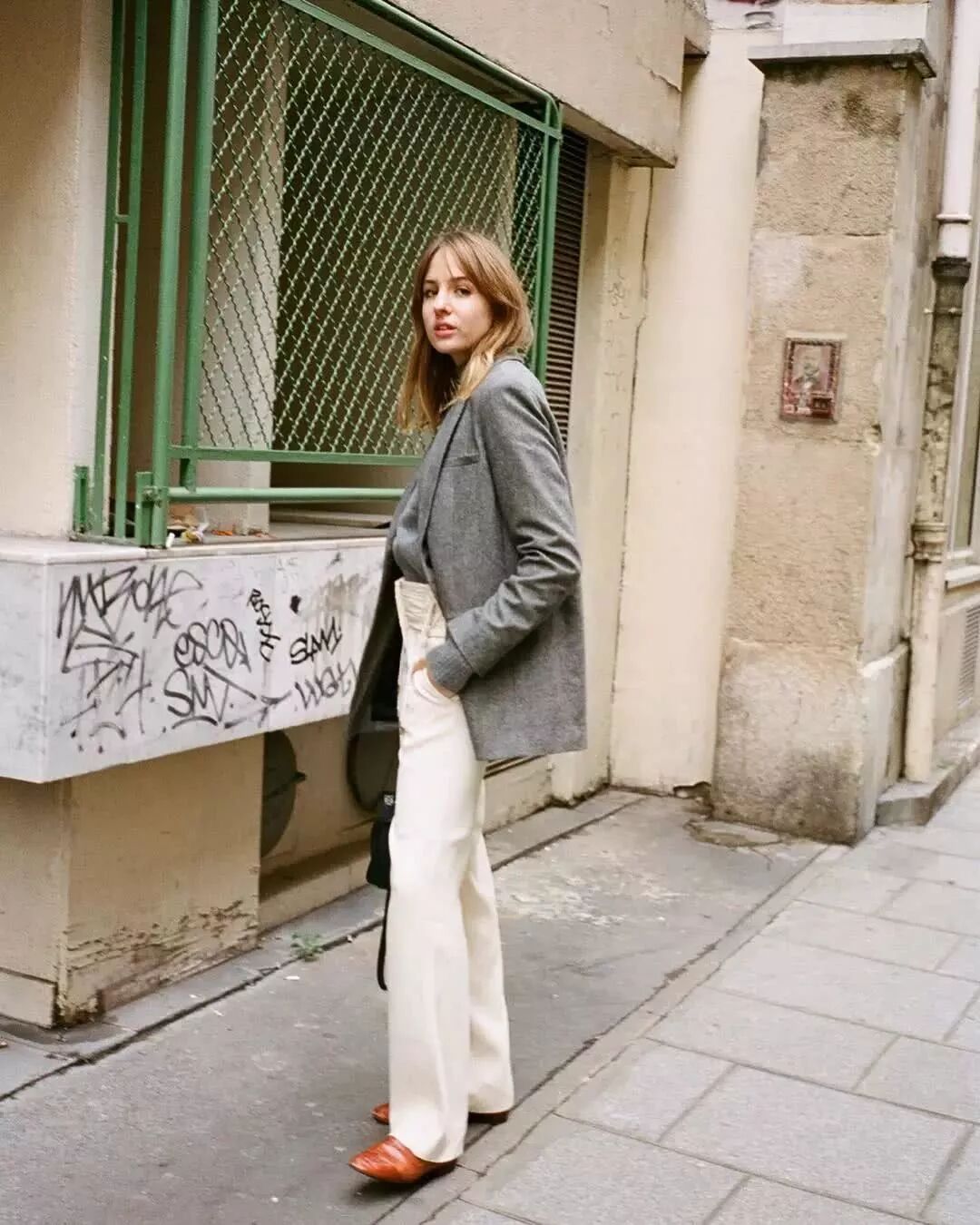 西装毛呢外套混搭奶奶衫+白色高腰裤,瞬间变得女人味十足,拗尽法式风情,知性又不失干练!