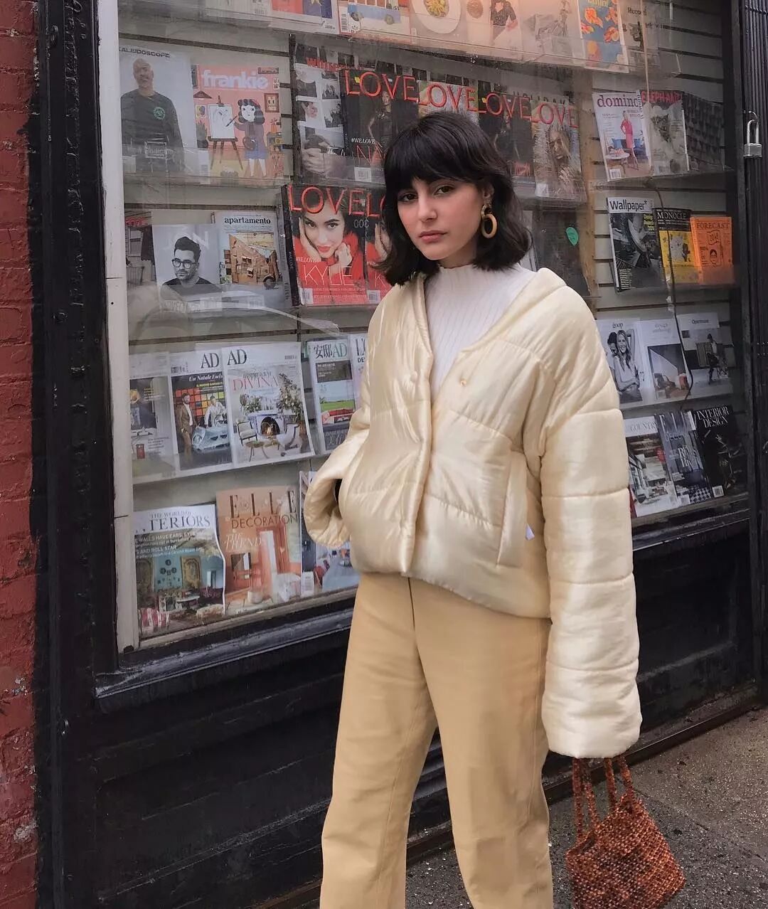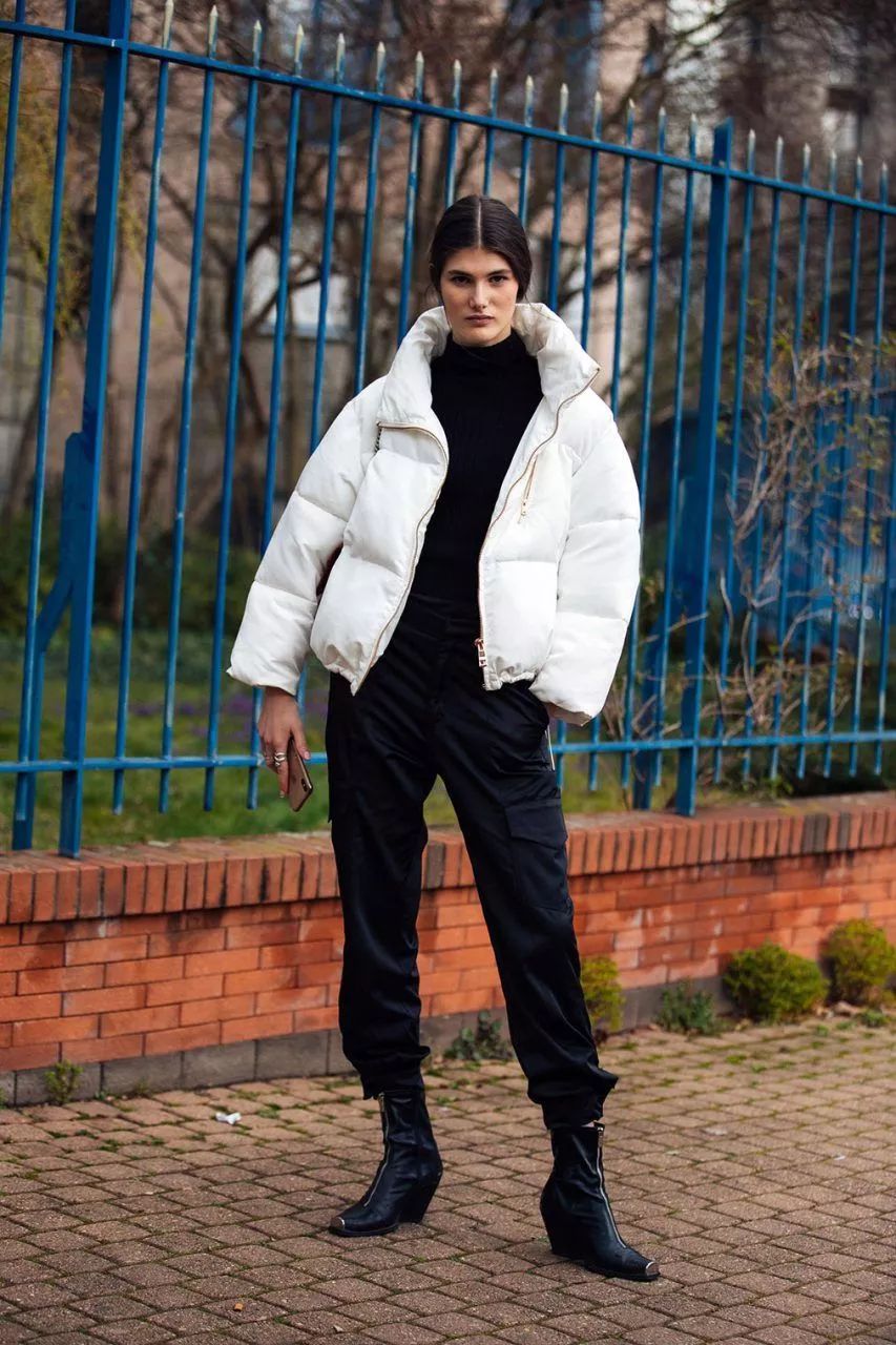 短款奶油色羽绒服+工装阔腿裤,白色毛衣点亮整体look,清澈又干净,复古又显温柔!