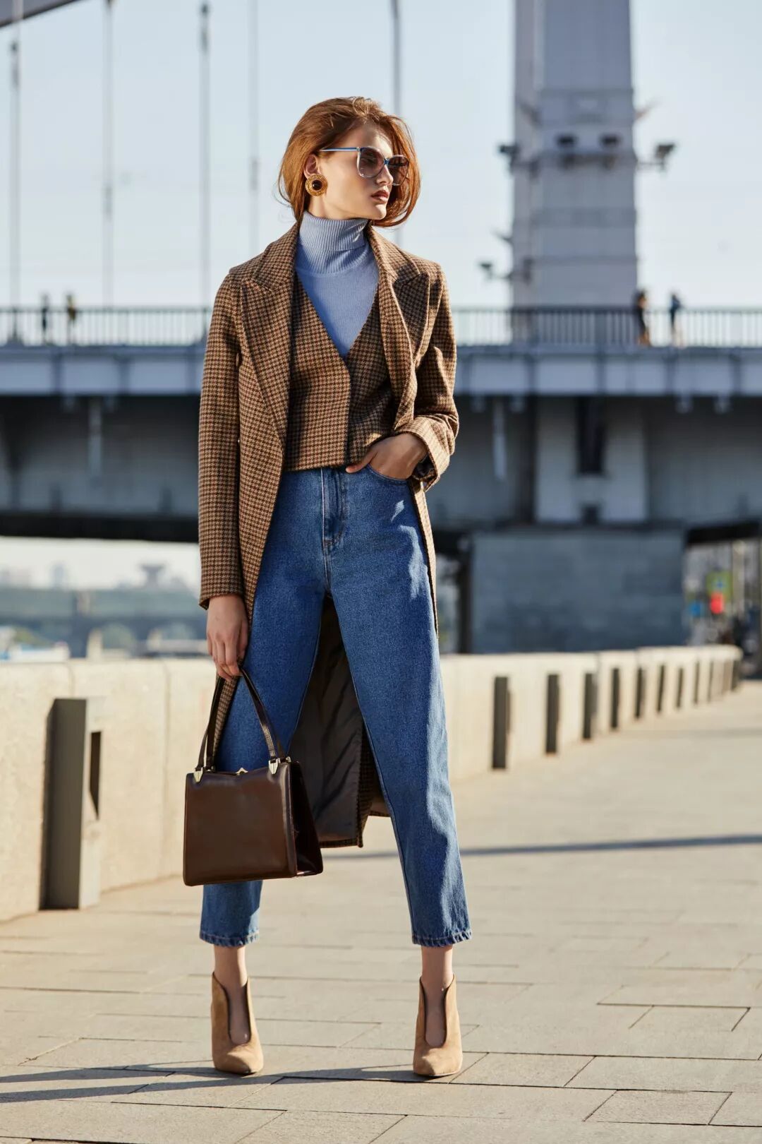 如果提到复古,想必一定是格纹当道!格纹大衣,大翻领设计修饰脖子线条和脸型,双排扣设计提升时装立体感,混搭小高领+高腰牛仔裤,秒变超模气场!