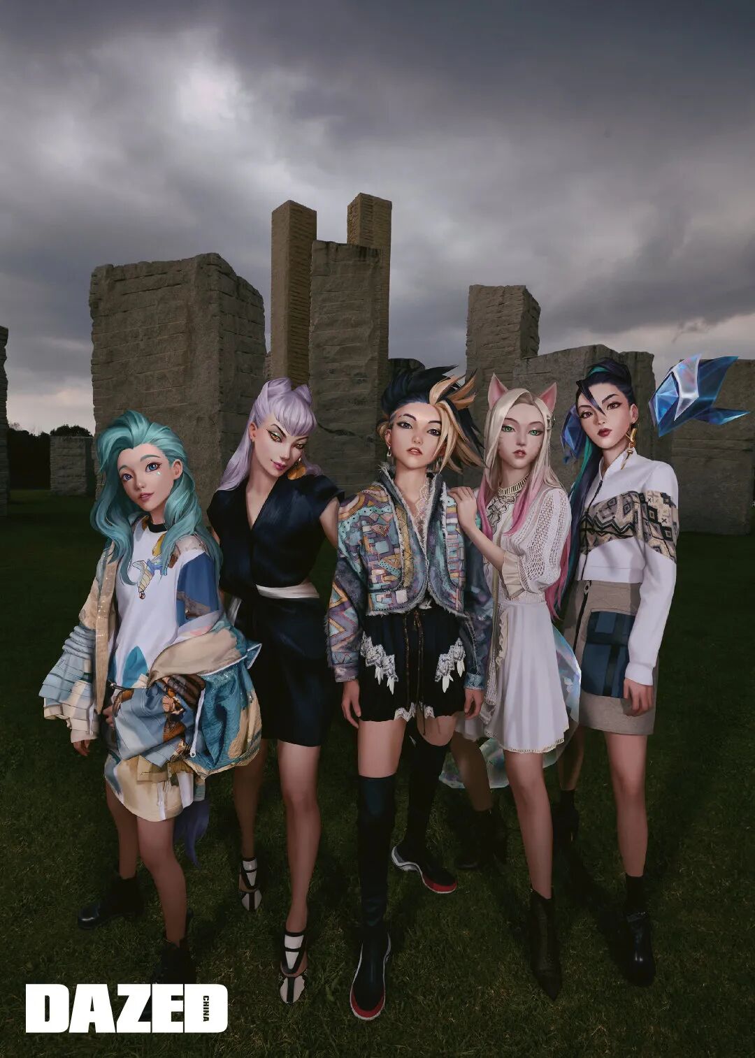 而在去年11 月,游戏衍生的 KDA 女团更是登上了《DAZED CHINA》的杂志封面,服饰方面全由 LV 提供,这种虚拟化的时装大片或许为以后的品牌指明了一条道路(当然,这并不是唯一的道路啦)。