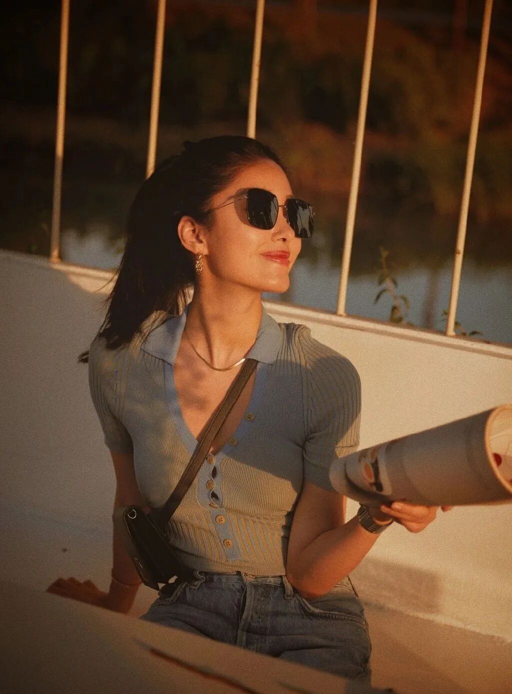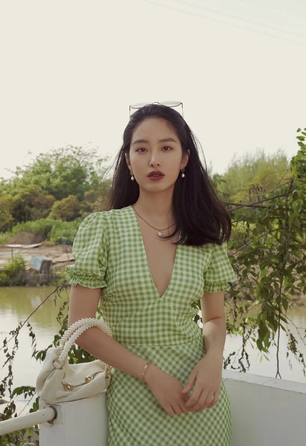 V领衬衫打造不露肉的小性感,棕色系条纹丝巾、墨镜和珍珠耳环加持,让整体搭配层次分明。