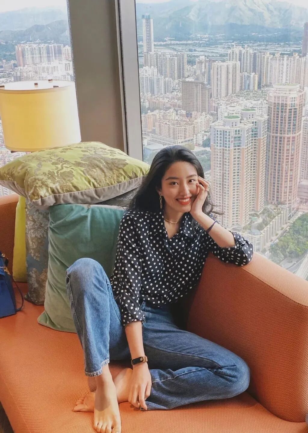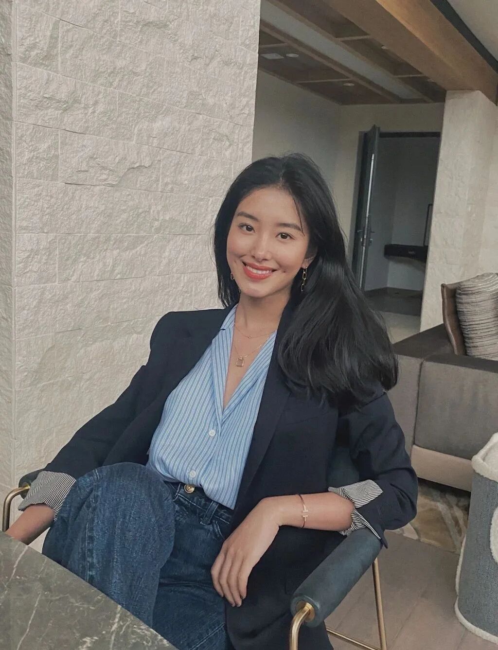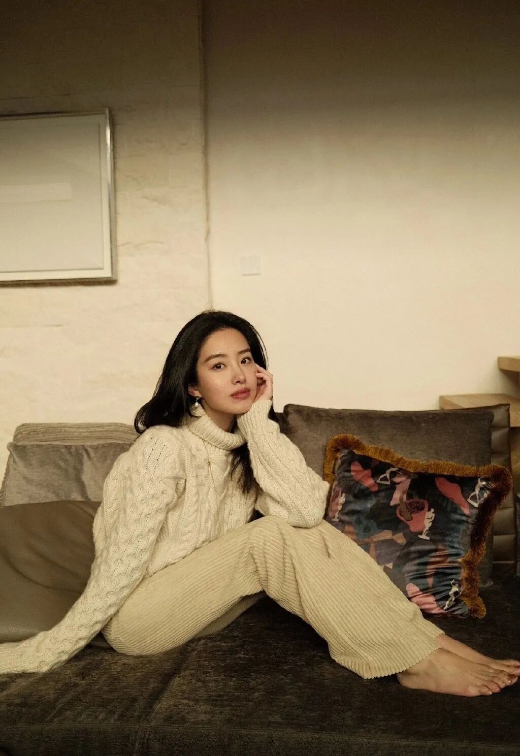 换上日常Look和慵懒披肩长发,居家的梁思申随性自然、同样出挑。