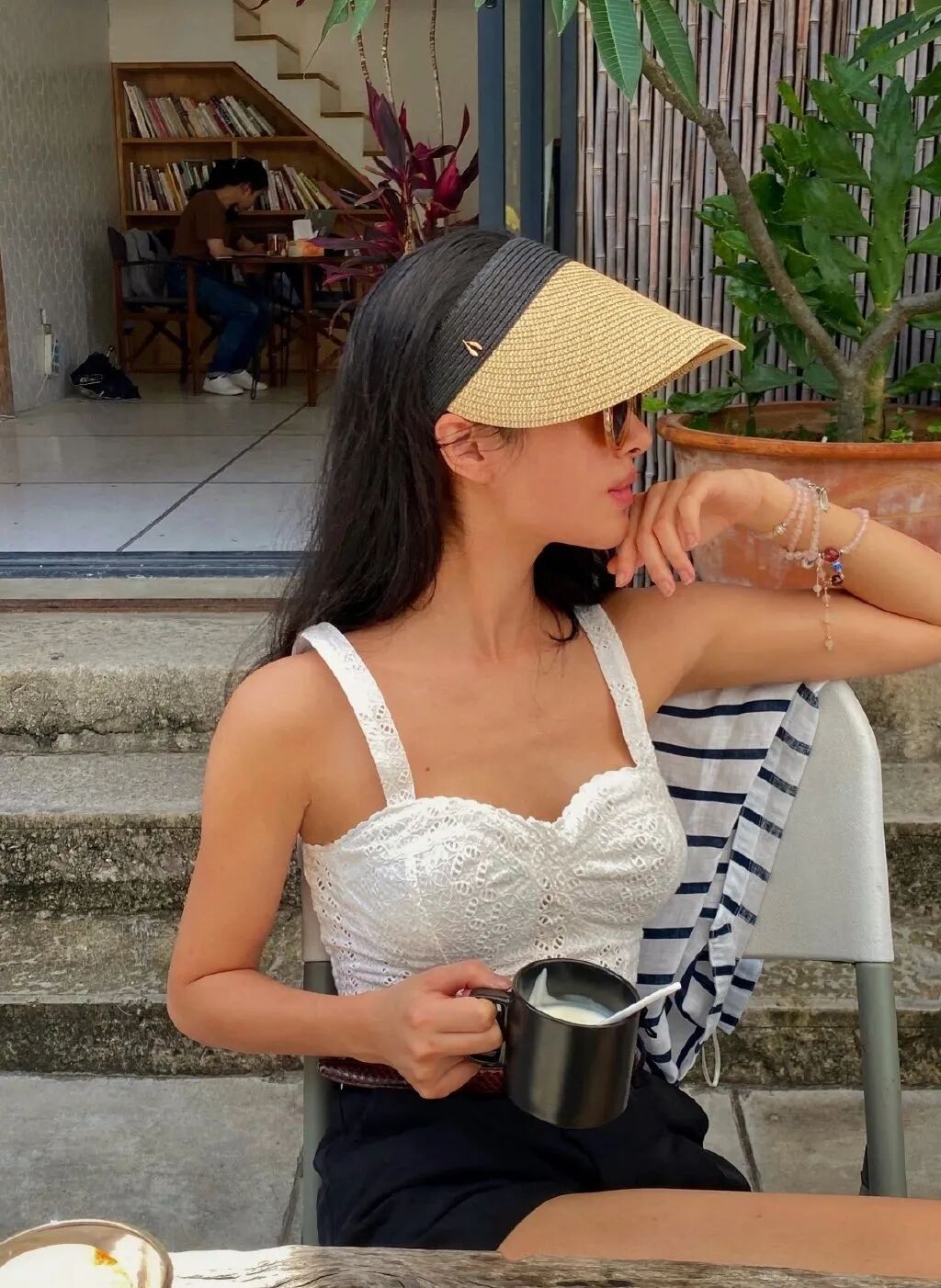 简约黑白低调内敛不过分张扬,搭配编织包包营造出满满的度假风。