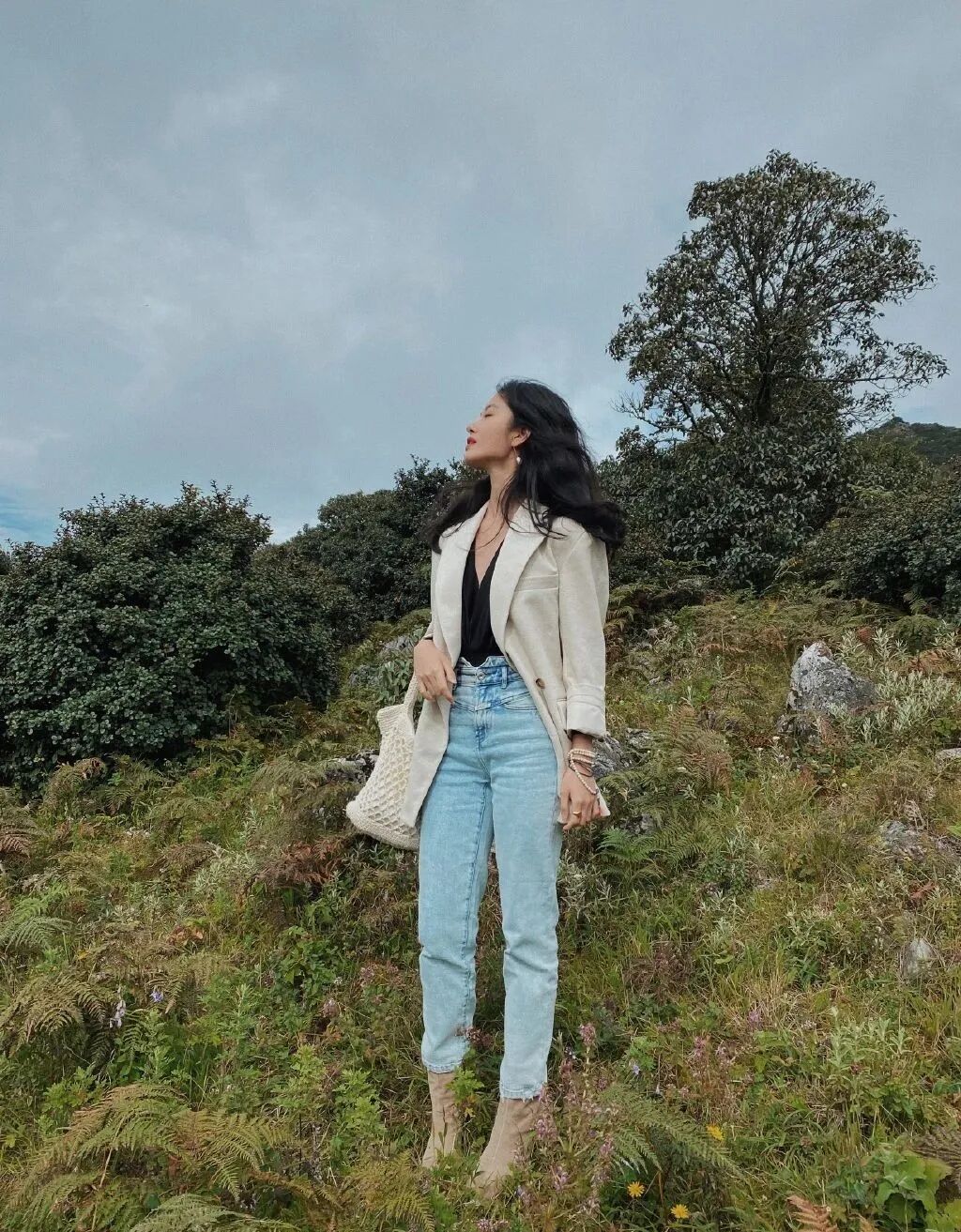 黑白搭配万年不变的牛仔裤简约又不失韵味,V领内搭将性感呼之欲出。