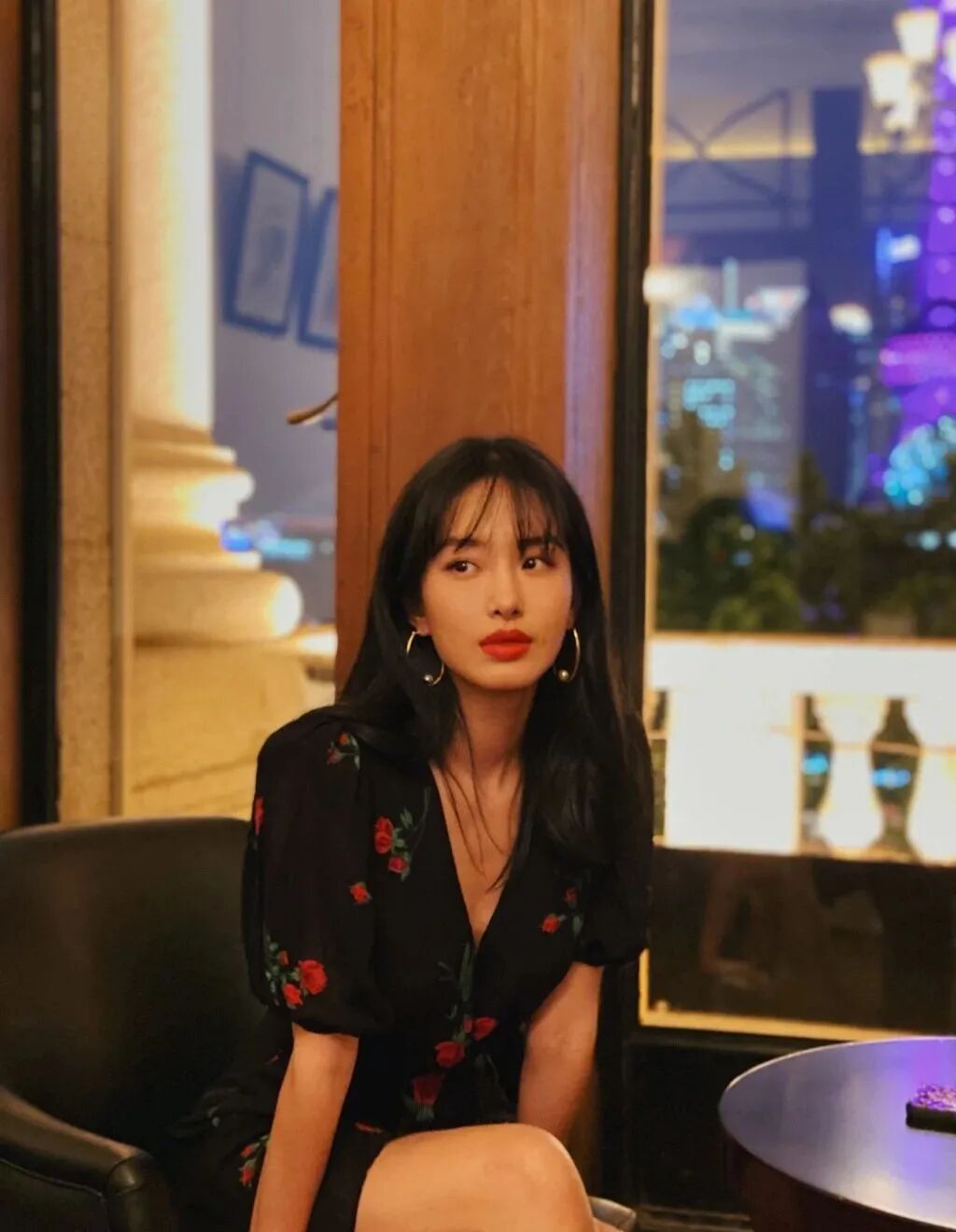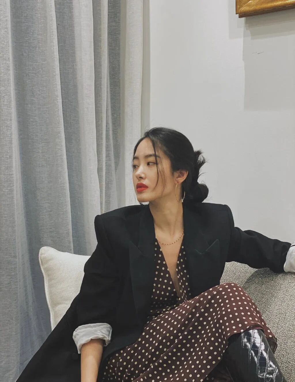 红黑撞色摩登复古,搭配大只金属Hoop耳环,展现出万种风情。
