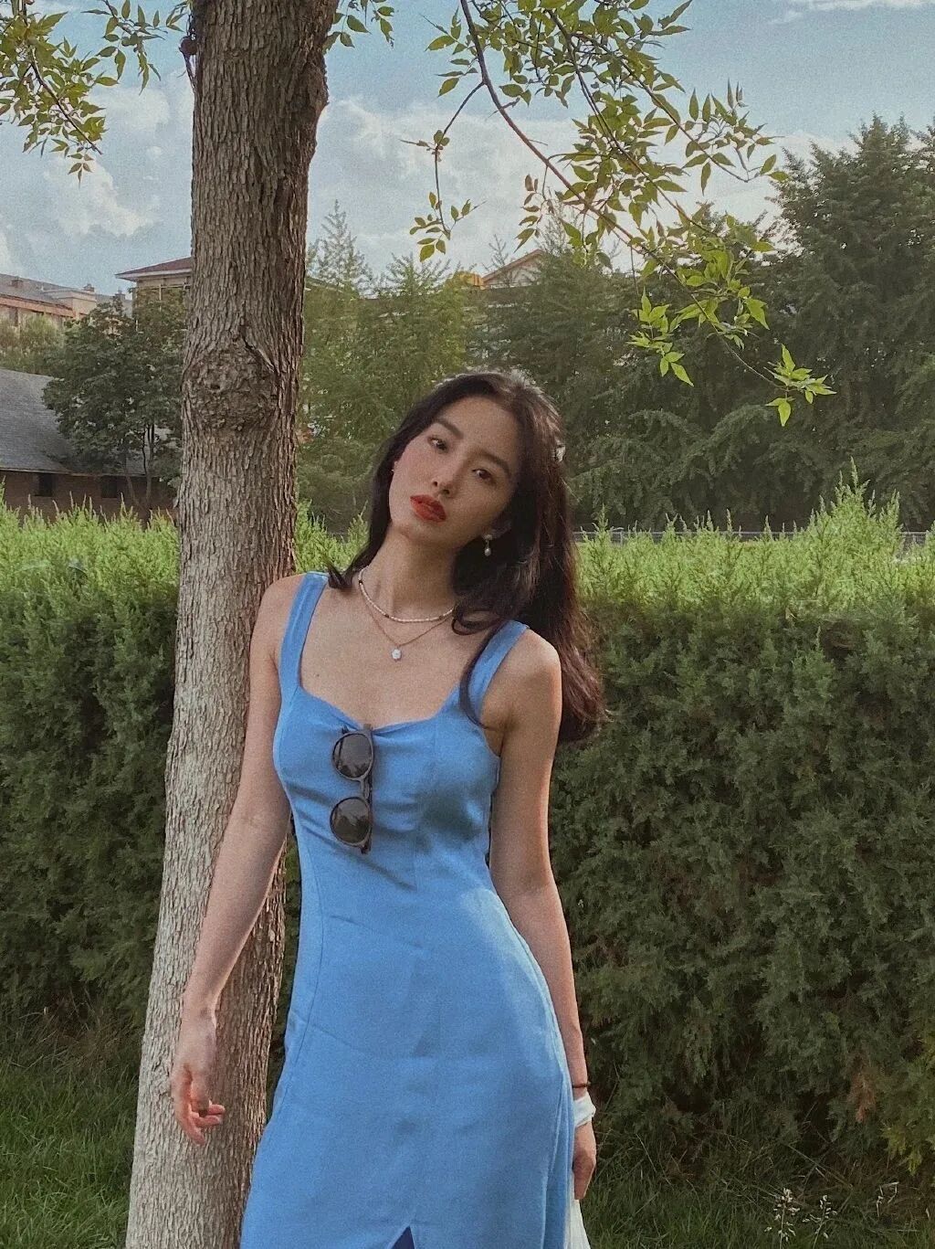 明艳大气的小雏菊蓝裙,滤镜加持下还有几分港风味道。