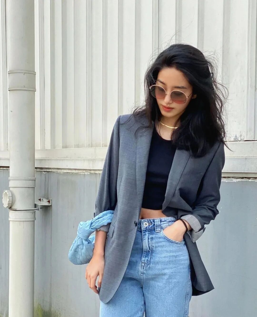 冷色调的灰色西装,就用清爽的蓝色BV编织包一键点亮。