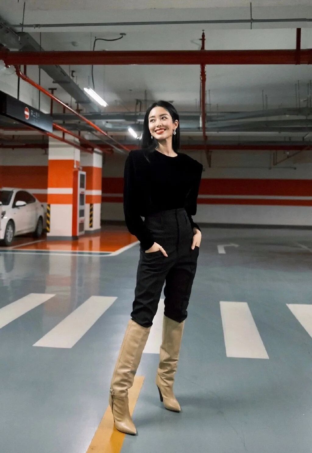 圆领黑色毛衣扎进高腰裤,强调出优越身材比例,配上高筒战靴气场足足的。