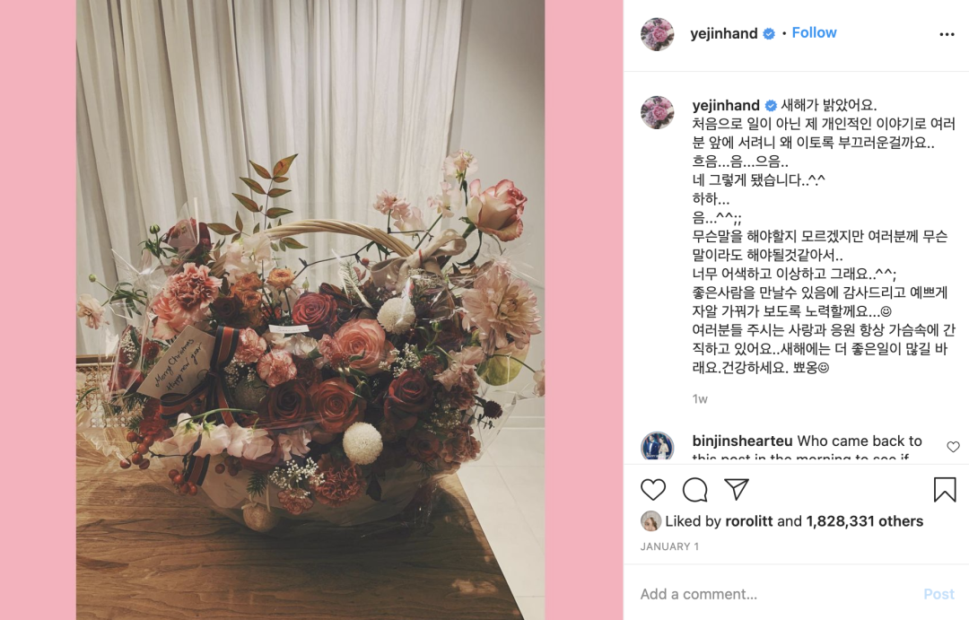 “新年到来了。第一次不是因为工作而是因为我个人的事情出现在大家面前,为什么这么羞涩呢...hmmmm...um...mmm...是的,事情就是这样的...^.^哈哈...好吧...^^;虽然不知道该说什么但感觉应该跟大家说点什么...实在好尴尬好奇怪呢...^^;我很感激能遇见这么好的人,会努力让自己更加美好....大家的爱意和应援我都一直珍藏在心中...祝大家新年里能有更多的好事,身体健康。”