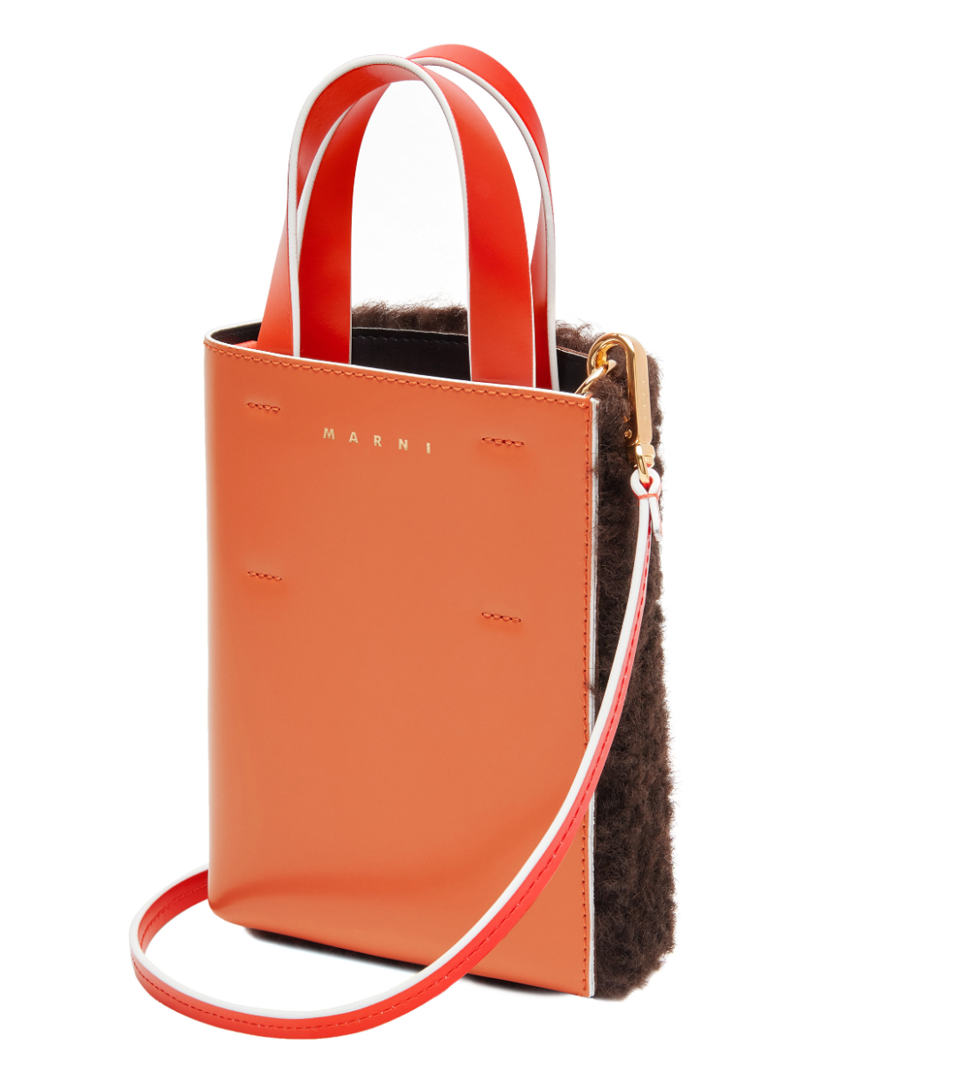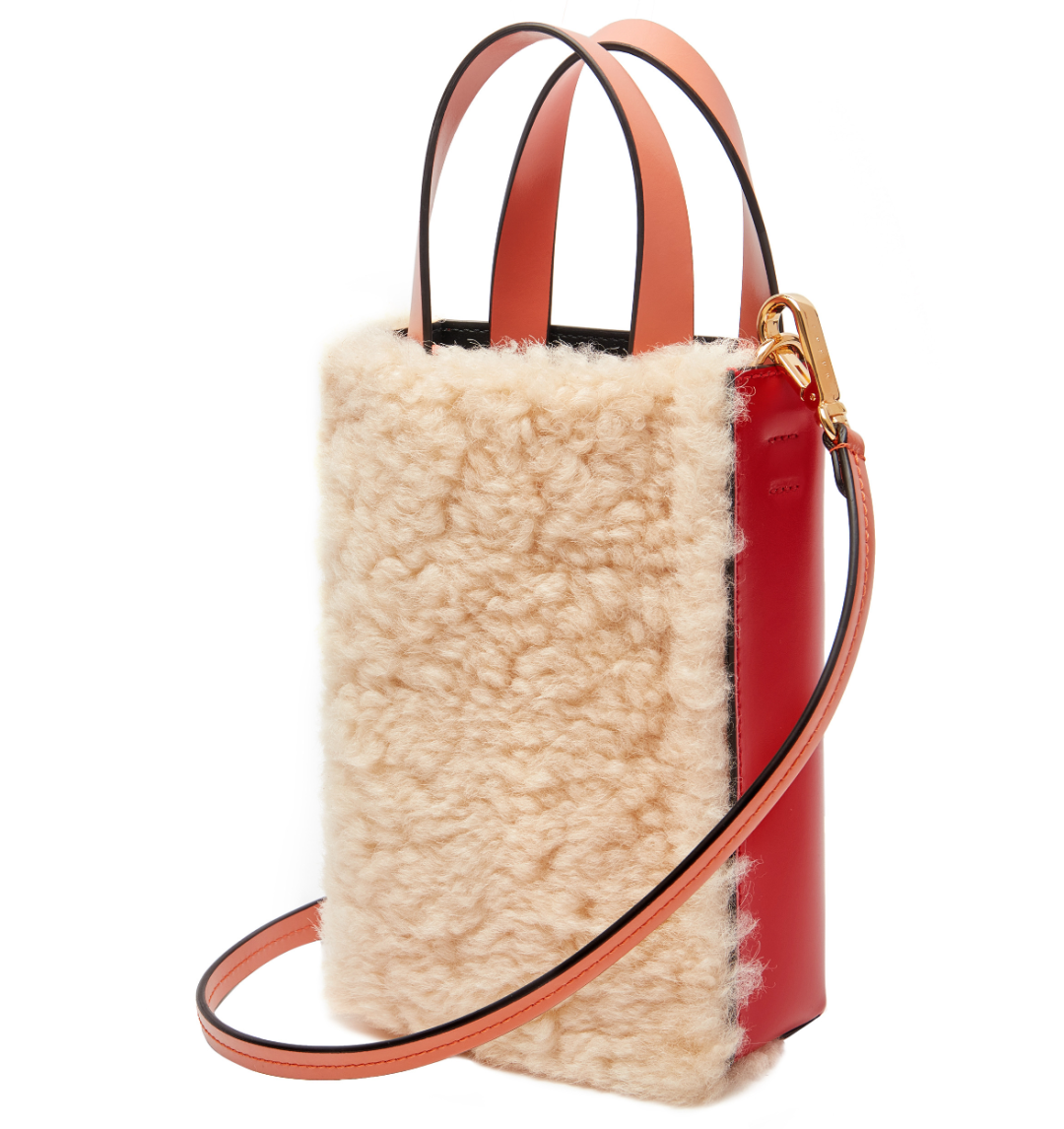 当然除了充满中国春联画风格的牛年特别系列手袋之外,MARNI别出心裁的在手袋设计里加入羊羔毛元素,使得包袋如云朵般轻柔松软,令人仿佛被浓浓春意与家的温暖层层包裹。此包袋亦拥有两款配色:深棕色羊羔毛与杏黄色皮革拼接搭配橙色包带,以及白色羊羔毛与红色皮革拼接搭配杏黄色包带。