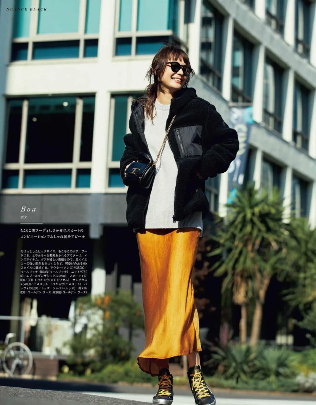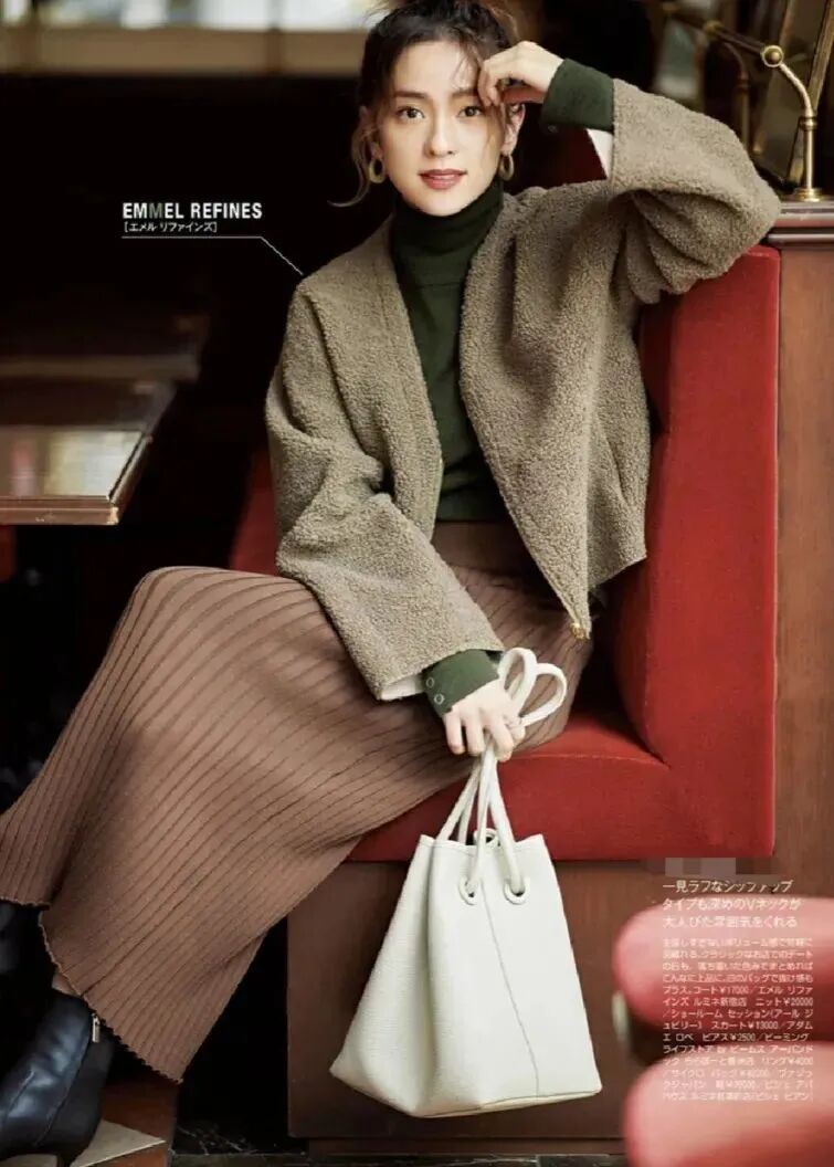 比大衣保暖,比羽绒服时髦,羊羔绒外套搭配裙子可以多选择一些独特面料的裙子与羊羔毛形成对比,真丝裙、针织裙、皮裙都是不错的选择。