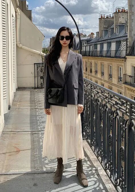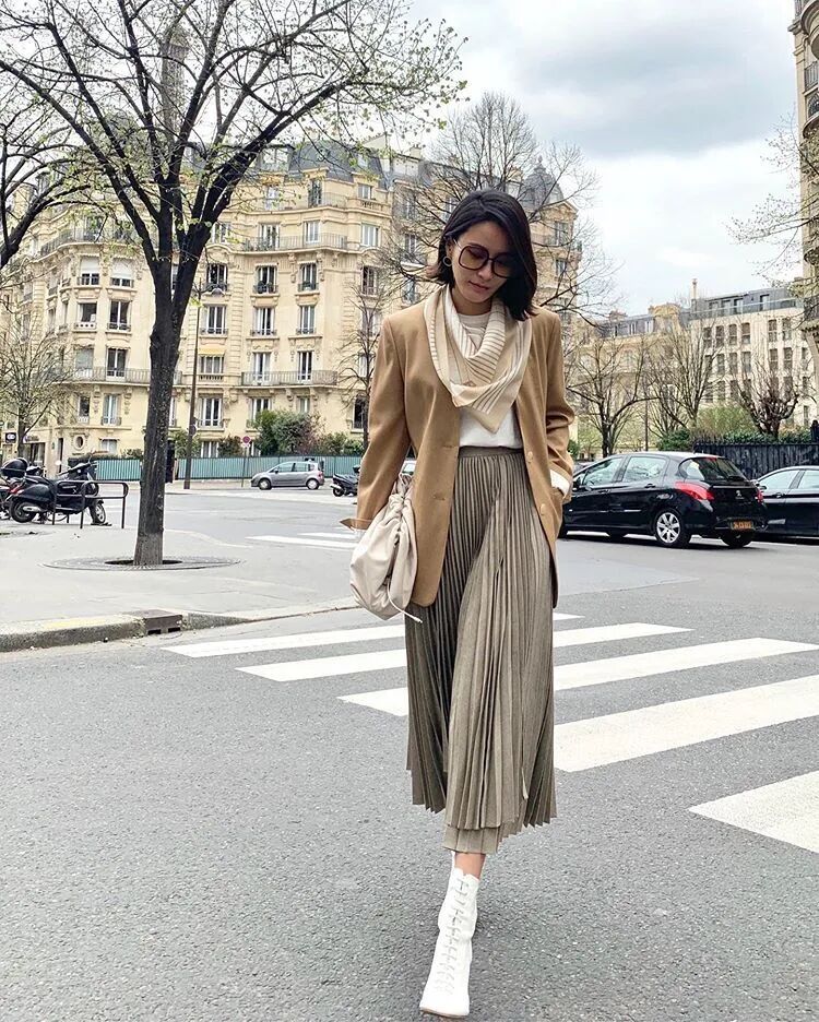 西装+裙子的组合,裙子用来点缀和平衡西装的重量感,这样硬朗帅气中不乏温婉可爱,可以一直从冬穿到春。
