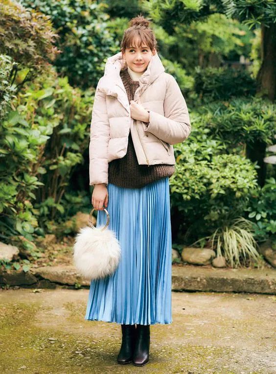 柔美浪漫的百褶裙,流畅的直线条是削弱羽绒服惯有臃肿感的最佳利器。让你的羽绒服look都不由变得仙气灵动起来。