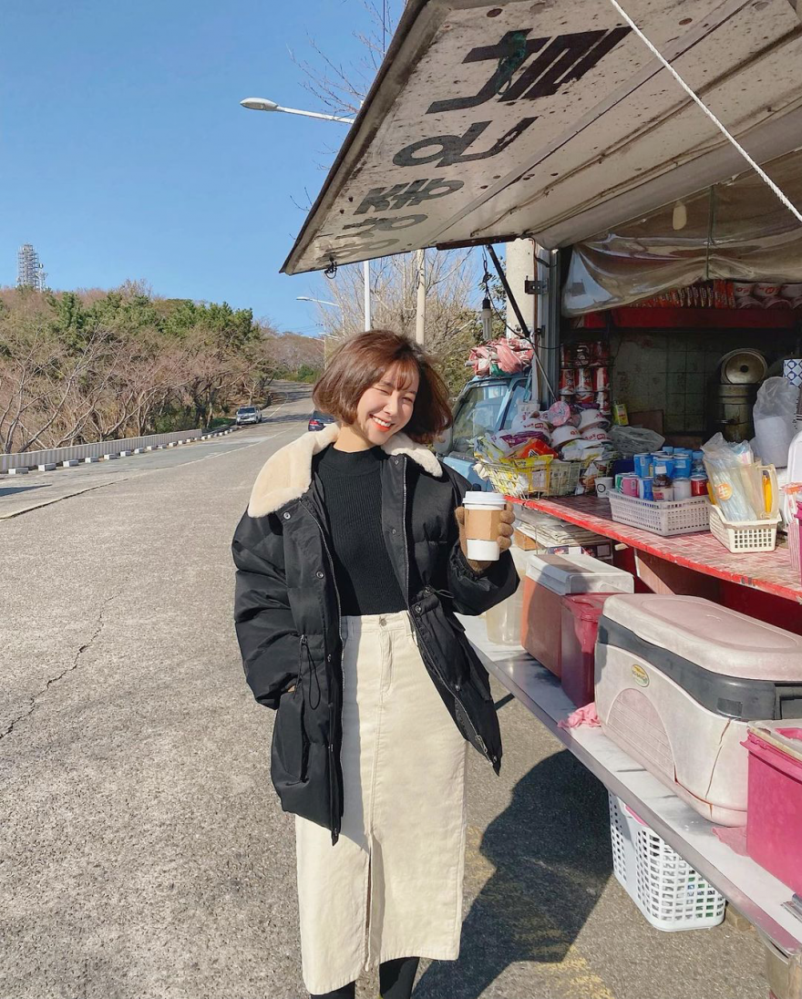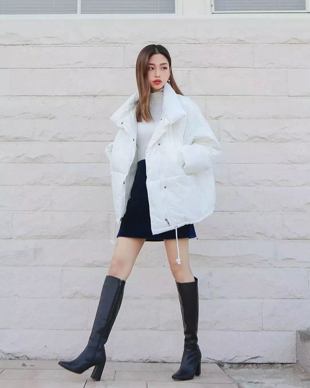 H型的直筒裙可以与上半身羽绒服的宽松感形成松紧平衡,搭配一些短款、中长款的羽绒服,遮胯显瘦不止一点点。