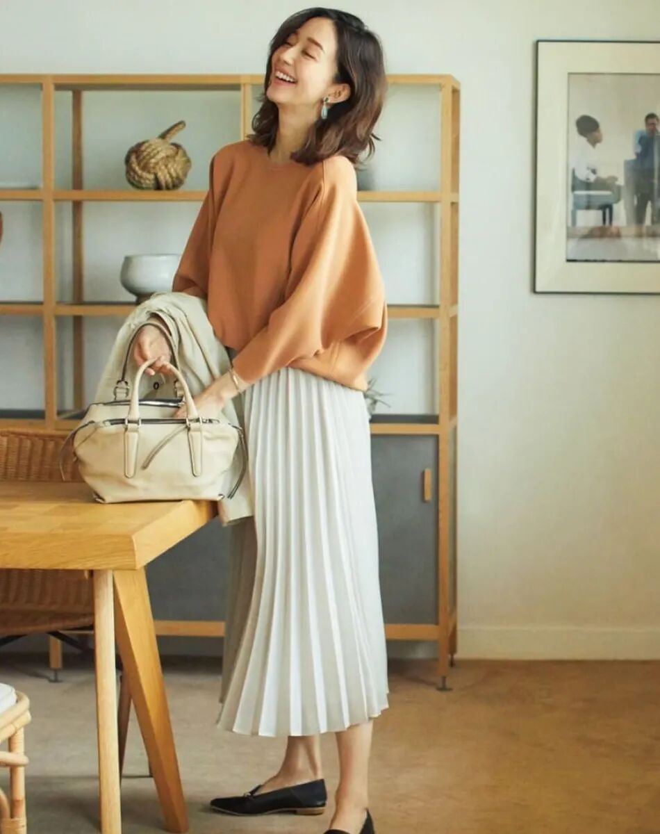 薄一些的打底衫贴身穿,适合选择A版型的裙子,上紧下松,大写的温柔好看~