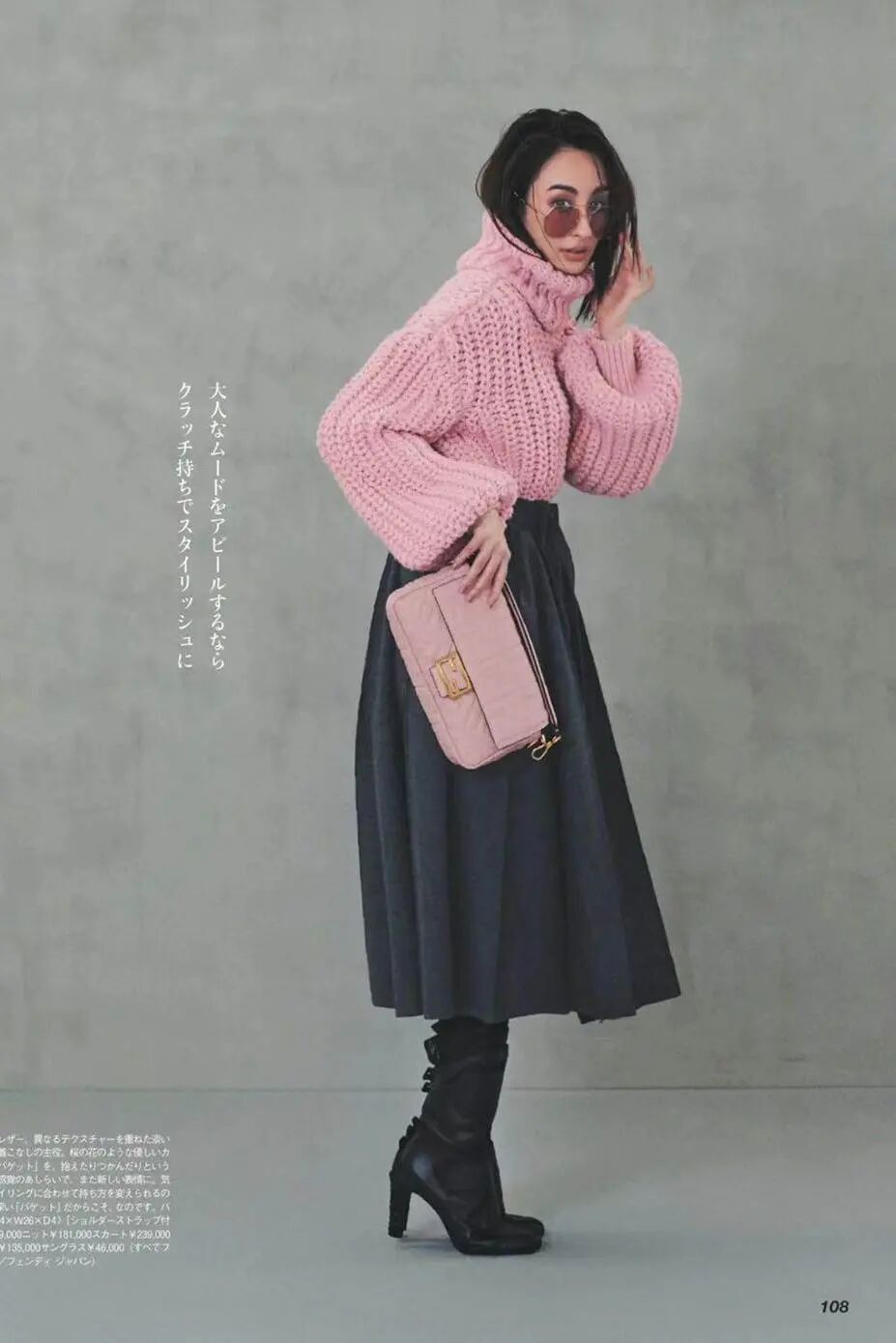 大毛衣不好塞衣角,搭配半裙时,可以把毛衣自然放下,遮住腰部和臀部,上重下轻打破秋冬季的沉闷感。