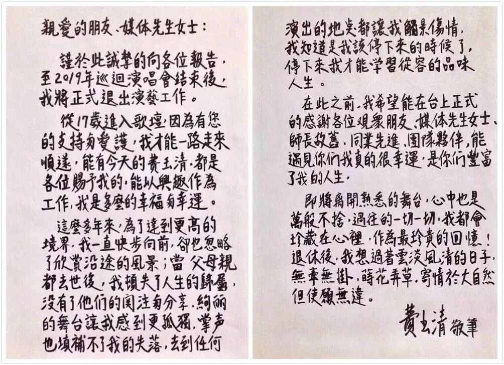 2018年,小哥给媒体写了亲笔信,正式宣布2021年巡演结束后会退出演艺圈。