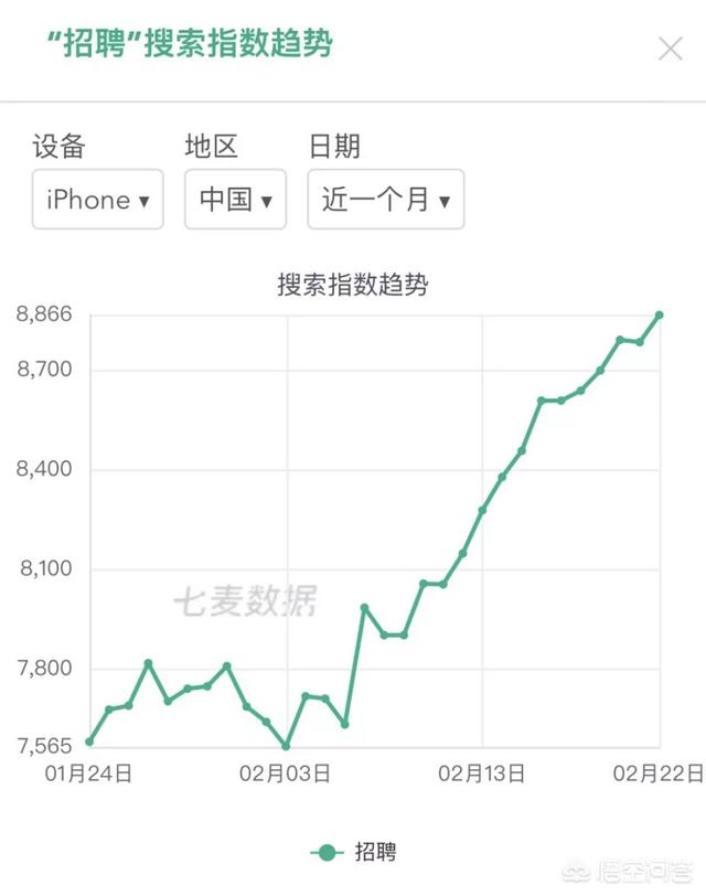 常言道“金三银四”,而且随着今年年初,不少大厂裁员不断,相信今年的招聘季会异常火爆。在七麦数据当中搜索关键词“招聘”来看,关键词的热度自春节后持续攀升,有更多的用户开启了找工作模式。