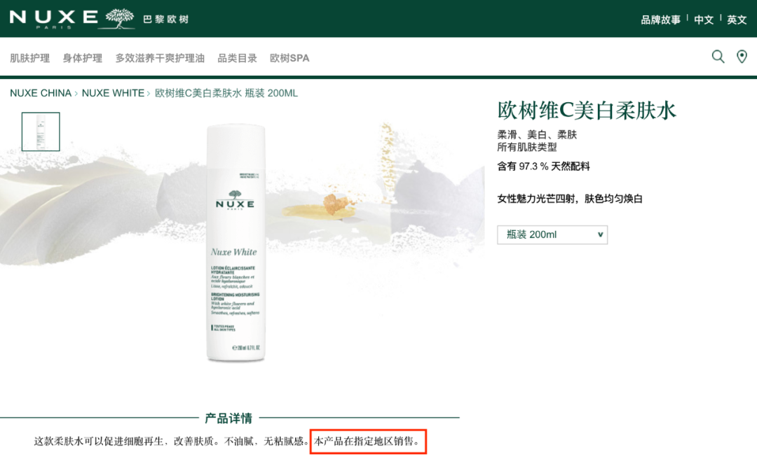 欧树在国内售卖的“NUXE White”系列,主打能让肤色均匀焕白,但在欧洲和美国的官方网站上都没有找到这个系列,国内官网也写了“本产品在指定地区销售”。