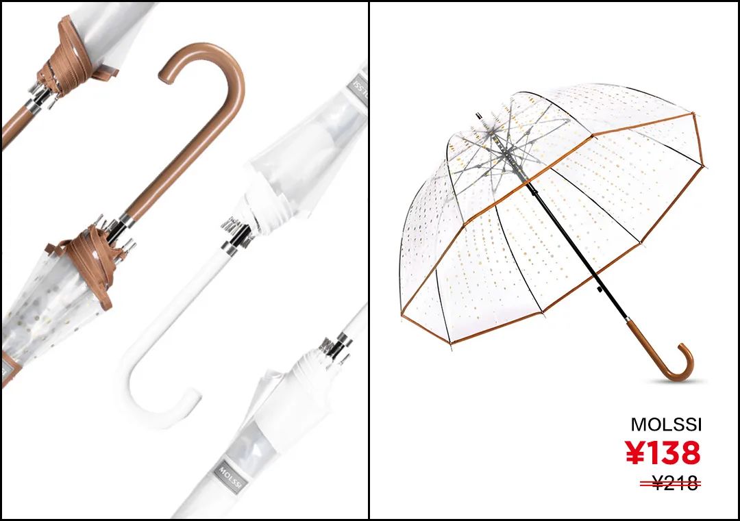 KEDDO这双懒人拖设计就很棒,下雨天本身就有点懒懒的,很多人都觉得索性穿拖鞋算了,但拖鞋又太随意,所以这种懒人拖正好。它用的是彩色PVC做鞋体,搭配的橡胶底像果冻一样,看着可爱。而且半拖的设计也不会闷,不会造成鞋子里都是水珠的情况,穿着也很舒服。它有三个颜色,少女心一些的,可以选这个天蓝色PVC和粉色底搭的,非常适合夏天。橘色更潮流感一些,非常吸睛,远远一眼就能注意到你。想百搭一些,它还有纯白色的,就算不是下雨天,平时拿来和连衣裙或者牛仔裤搭配着穿也很好。夏天,很多人都爱拿马丁靴搭连衣裙穿,好多女明星都特别喜欢这样搭。那索性买一双下雨天也可以穿的马丁靴好了。比如KEDDO这双,内里特别用了真皮,柔软又透气,不会闷。鞋面上在脚跟和脚趾的地方都做了拼接,把这两块挡住,就算赤脚穿靴子也不会很怪。它还用了很时髦的明线设计,像这个白色和橘色拼接的款式,就属于弹眼落睛,又特别有质感的。设计师还特别认真地挑了个卡通插画的鞋底,平时放在鞋架上美观度也不错,穿的时候心情也会很好。平时还能搭个彩色或者印花的袜子,自己去“DIY”这双雨靴。划重点!KEDDO的这两双都给了ELLE独家超低价,现在入手超级划算的哦~有没有适合下雨天穿,不怕溅水,不容易脏的小白鞋啊?有的。就是这个ROCKFISH的防溅水系列。它的材质非常特别,用的是碳氟化合物涂层(Fluorocarbon),隔离水油,当水滴到鞋面上即呈露珠状滑落。今年夏天ROCKFISH出了一款帆布半拖,穿起来方便,还很凉快,对于平时想穿拖鞋但又觉得不太正式的人来说,这双鞋就可以穿去上班。而且,它有个隐藏优点,就是很显腿长。因为侧面往下凹,所以拉长了脚踝部分,视觉上腿就细了、长了。鞋垫还是这种天然乳胶做的,回弹力很好,能缓震,不会发生踩着拖鞋脚底板很痛的情况。对于喜欢基础款小白鞋的女孩来说,编辑最推荐的是这款防泼水小白鞋,看出它特别的设计点了吗?它是一脚套的!不用系鞋带。设计的时候,在鞋底这里加了一圈黑色的边边,视觉上就不会太单调,时髦感一下子就上来了。编辑自己也有这双,平时出门一套就行,从此再也不想穿系鞋带的鞋子了。想要一双少女感满满的一脚套当雨鞋?这种“果冻鞋”建议你试试。MOLSSI是个做伞具的品牌,设计的伞都是非常有设计感的那种。今年特别推出了这种下雨天也能穿的鞋。果冻鞋最大的优点是什么?耐造啊。不论怎么淋雨。怎么弄脏,洗一洗马上变全新。很多女孩喜欢蝴蝶结装饰,但总不会打,或者买来布面的蝴蝶结都不够挺。那这种果冻鞋的蝴蝶结装饰就可以满足大家了。MOLSSI的这双不但视觉上很Q很可爱,闻上去也有淡淡的奶香,抵消了糟糕的天气带来的坏心情。它的鞋口设计成了波浪形,很贴合脚面,穿进去一点都不磨脚。而且鞋子也很轻,才180g,穿着就像第二层皮肤一样。这种一体式的“果冻鞋”完全不用担心脱胶问题,环保又好穿,爱了爱了。它还有一款设计上简单成熟的,适合上班的时候穿,搭配西装西裤很有气场和气质。鞋型是不会过时的乐福鞋的样子,侧面还有透气的孔,穿着走一天也不会粘腻。平时忙于工作,最怕的就是还要花时间洗鞋,这种一擦就干净的果冻鞋真的给大家省了不少事呢。英国的天气有多“喜怒无常”大家肯定都知道,要说专业的雨鞋、雨伞,肯定首先想到找英国的。Rockfish这牌子就是很适合年轻人的专业英国雨鞋品牌。别看是靴子的造型,但用的都是环保橡胶的材质,没有什么异味,不用担心夏季闷出味道的问题。最适合夏天的呢,就是这种短款的切尔西雨靴了,一年四季都可以穿。清爽又年轻一点的,就是珍珠白的款式,春夏季配裙子或者牛仔裤都可以穿。好搭又低调的,就是它的麻面黑,比漆面的雨靴更有质感,配什么风格的衣服都很OK。因为淋湿了以后的伞,就算折叠起来也只能拿在手里,才不弄湿包袋。而再套个塑料袋又太麻烦,所以既然都要拿着了,还是长柄的更有腔调。英国贵族肯定是和编辑一样想的,所以王公贵族都用的是这种长柄伞。英国第一“时尚KOL”伊丽莎白女王最爱撑的雨伞就是Fulton。在拥有无数套彩色套装的同时,女王也会选一把不同颜色的Fulton伞来搭配它们。Fulton已经拥有60年历史了,是英国皇室指定御用的雨伞品牌,坚持手工制作,创始人是机械工程师和发明家,所以Fulton的伞内部架构一定特别坚固,耐用灵活。女王最爱撑,也是最火的一把伞是Birdcage,俗称“鸟笼伞”。是Fulton专为女王定制的款式,它拥有穹顶式特殊的结构,半个身子可以躲在里面,还不影响视线。女王同款的伞并非天价,300+的价格能买到同款,可以说是性价比非常高了。鸟笼伞也出一些非常有艺术感的联名,比如这把,和伦敦博物馆的联名,上面印的就是气派的英伦建筑。拿在手里一点都不单调,撑开整个伦敦都在为你遮风挡雨。说到英伦,很多人肯定都会想到老派绅士撑着伞,站得笔笔直的电影片段。Fulton的这种绅士伞,就是真实的威廉王子同款,平时皇室出门撑的就是它。绅士伞的特色是伞柄,做成了这种古董质感的木头弯柄。不管是拿在手里,还是举着,都非常有腔调。里面设计了这种复古式手动开关,减少了现代工业气息,让每一次开伞关伞都很有仪式感。前面提到的MOLSSI也有这种透明的鸟笼伞,做得形状相对没那么立体,比较日常的感觉,价格也相对更实惠。平时喜欢透明伞的女孩呢,与其随随便
