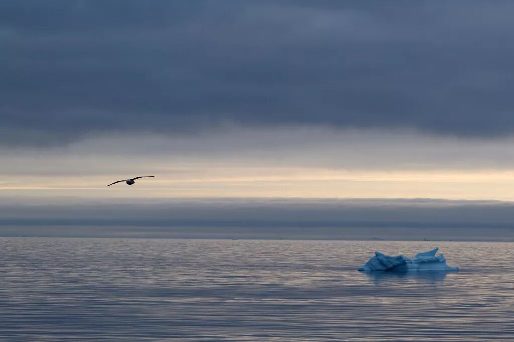 在他的身后,破碎的浮冰随海水飘着,山上融化的冰层不断下落。虽然是夏天,但天气并不晴朗,极低的寒风依然凛冽,海鸟在空中悲鸣。