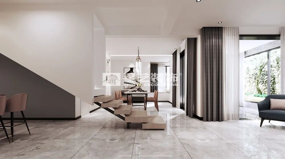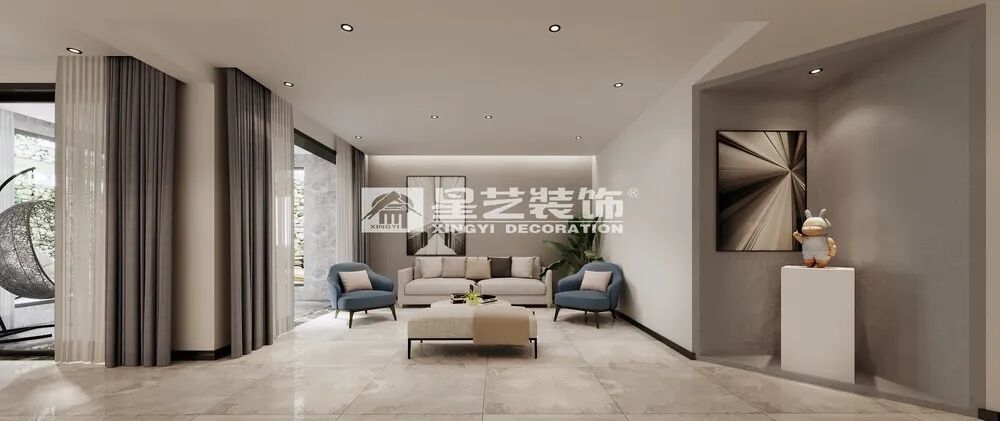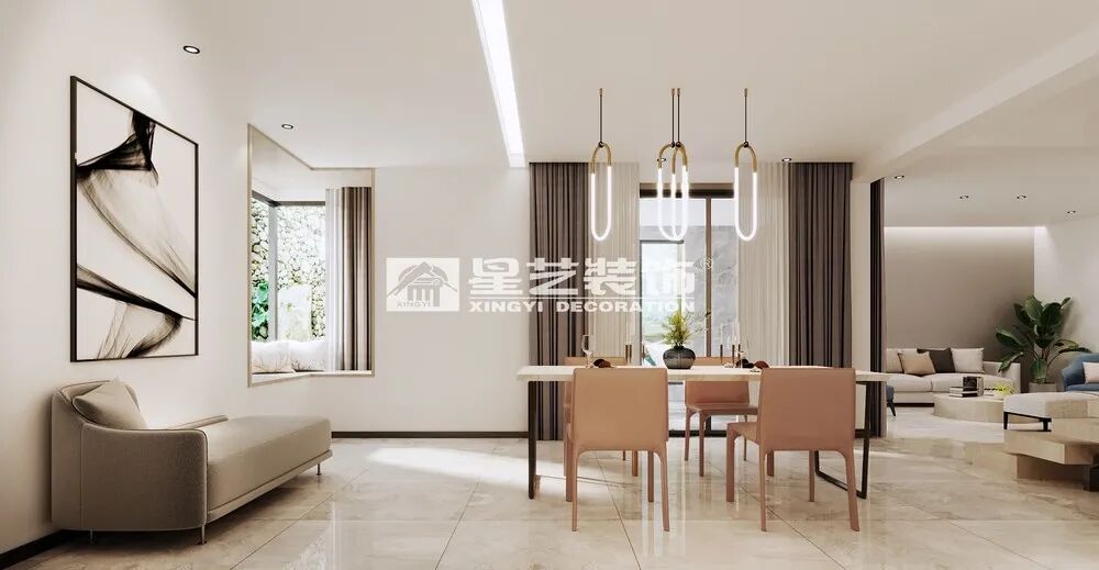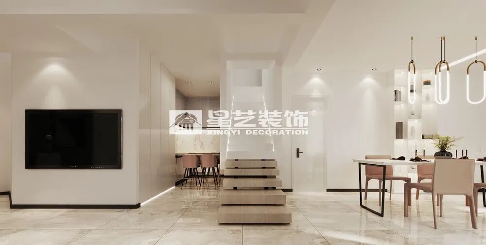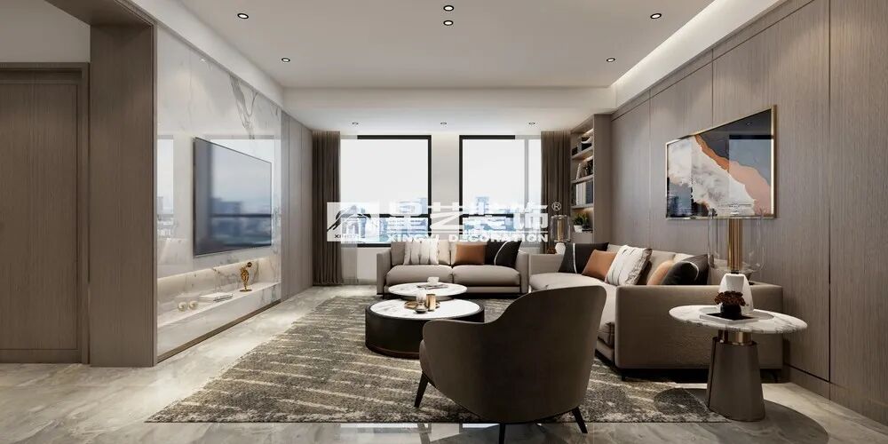 客厅简洁的调性,设计师运用纯洁自信的高级灰,点缀大地色系定格静默时光,极其讲究的空间阔且圆满。