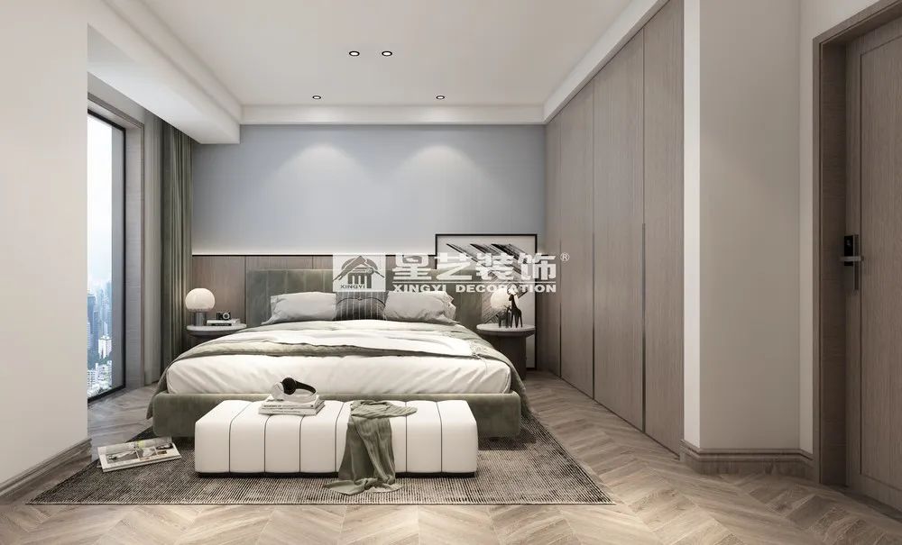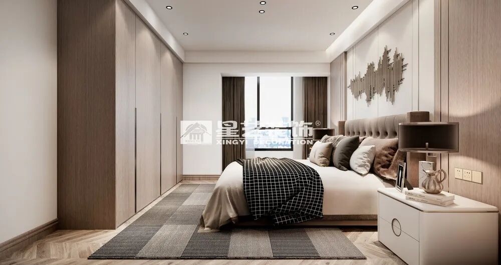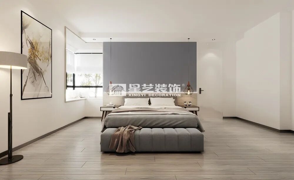 卧室温馨木质地板配以暖色床品,暖色舒心,即便空旷的环境也不失温暖,形简而神不简。