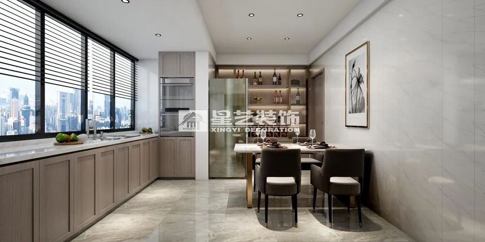高级灰+原木色增添了空间的趣味性和气质美,隐藏储物功能的设计显得干净利落,局部金属细节搭配,注入平和温润的气质,使餐厅空间轻松现代却不失仪式感。