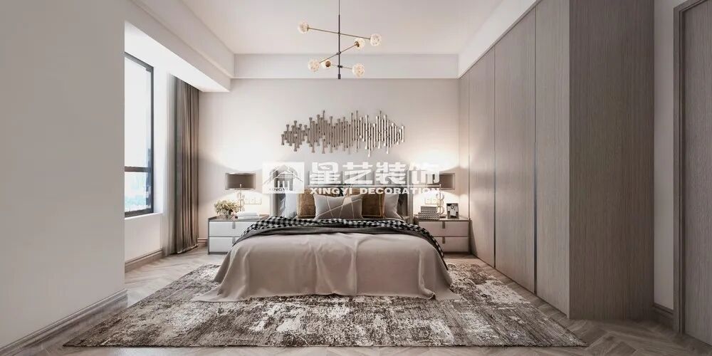 卧室空间在设计师的巧妙布局下线条多而不杂,平和静谧,和谐互融,似有古典雍和的境界,几何元素构成的抽象画作,与室内散落的光点交织,映出生活的从容志趣。