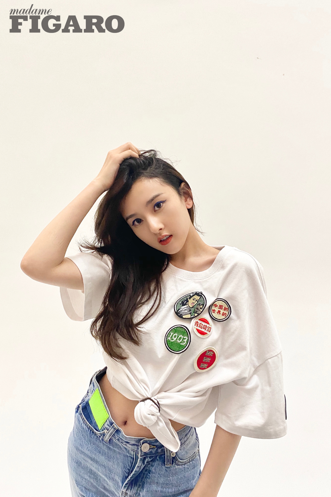 宋祖儿则选择了青岛啤酒国潮魔术贴短袖,在T恤下方打结将其改造成短款,拉高腰线,大长腿展露无遗。