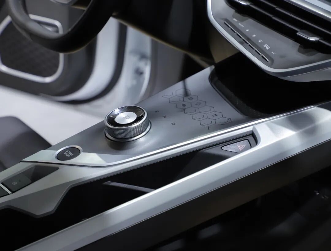 中控部分,12.3英寸的悬浮式中控屏搭配下方不规则的空调出风口,挡把处除了挡位调节旋钮和无钥匙车辆启动/关闭键之外,还采用了称之为E-Touch中央超感触控区的触碰式按键,整体设计和功能区块看起来简洁明了。