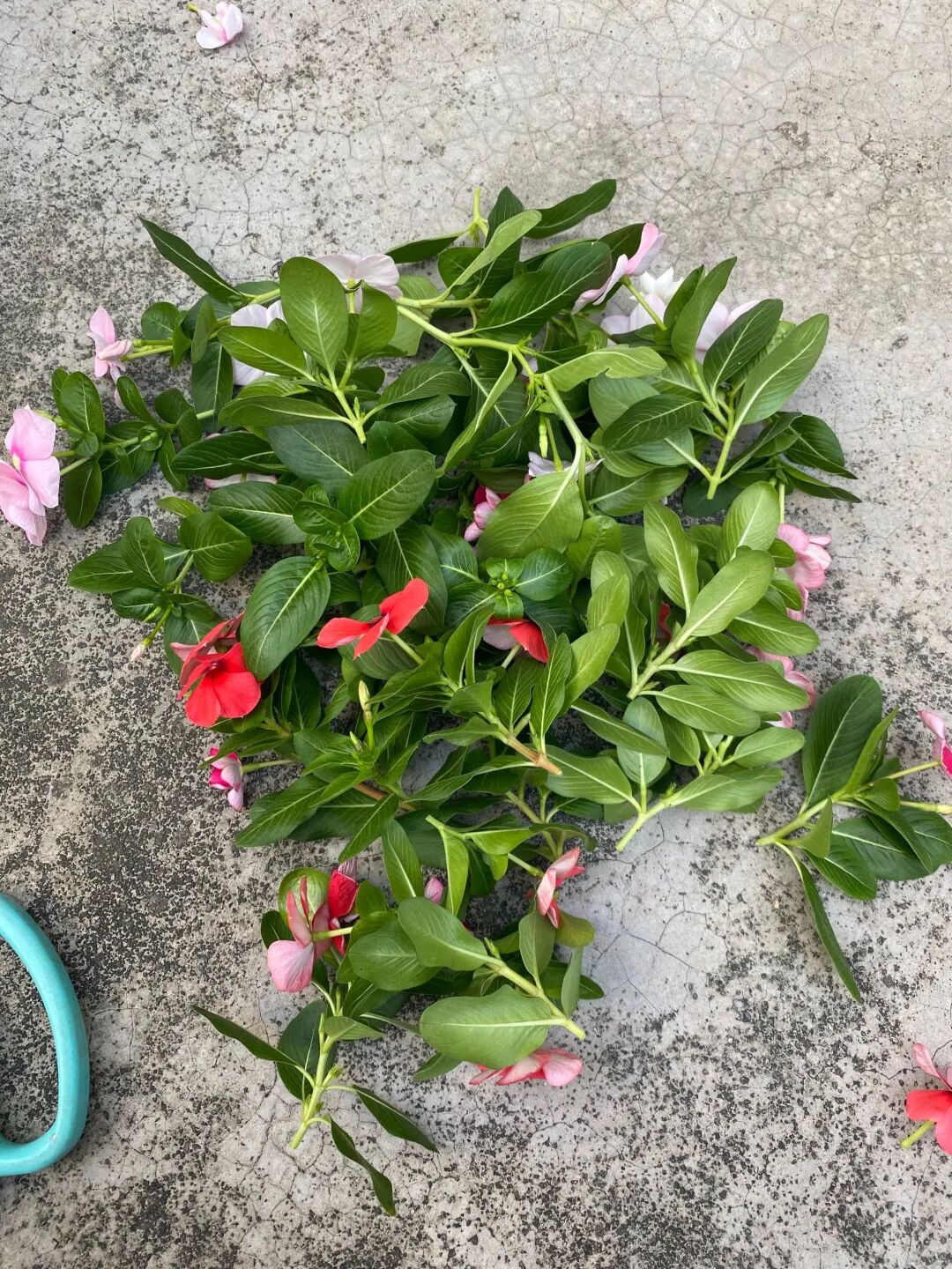 2、如果长春花整个植株长得像八爪鱼,那就给它所有的枝条都打顶,让它整盆的枝条都处在齐刷刷的长度里,这样才更容易开成花球。