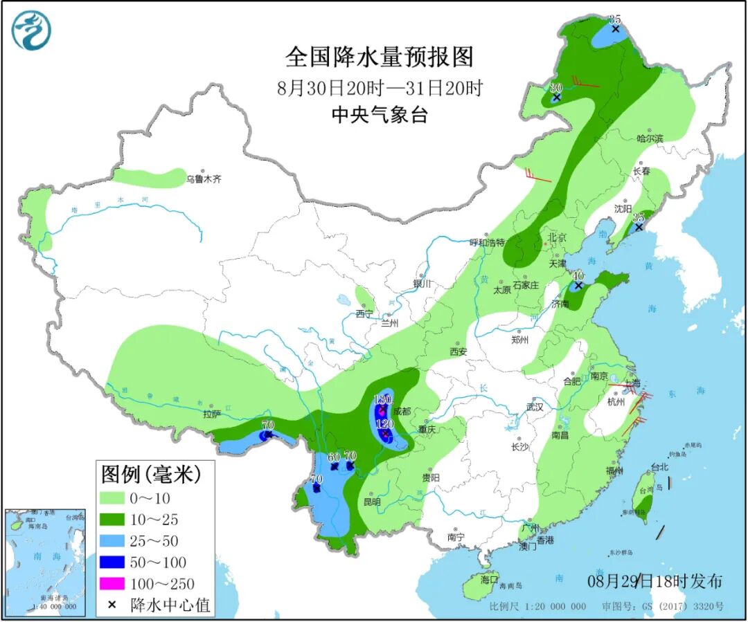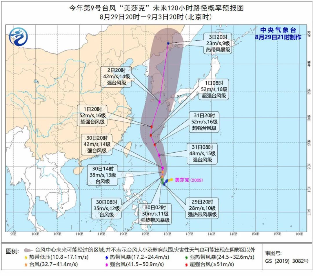 受其影响,8月30日夜间至9月1日白天,东海大部海域将有7~9级大风,其中东海中东部海域风力可达10~13级,台风中心经过的附近海域的风力可达14~16级、阵风17级以上。除了大风,9月3日至4日“美莎克”还可能给东北地区带来风雨影响,不过时效较远,保持关注。