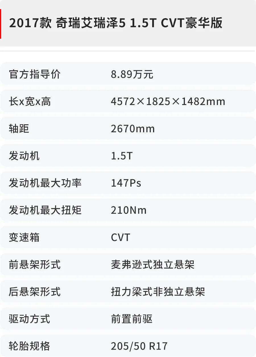 动力总成方面,艾瑞泽5搭载的是1.5T涡轮增压发动机,最大马力为147Ps,峰值扭矩为210Nm,与之匹配的是CVT变速箱。这副发动机并没有用上直喷技术,依然为电喷,其参数如今看来有些不入流,但是官方称这台发动机的热效率达到了37.1%,即使放在现在也是国产车中的拔尖水准,看来省油和保养成本低才是它的重点。