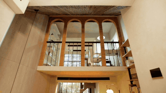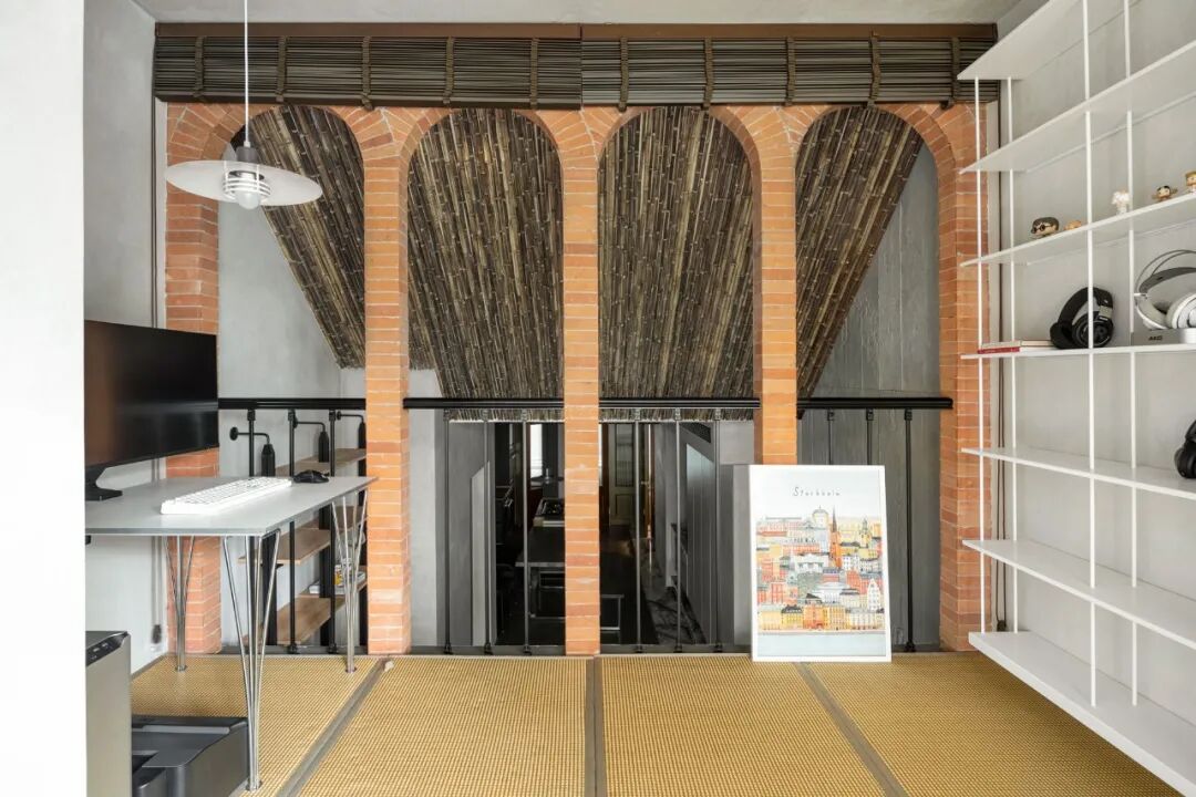 换上了4个拱券形的隔断,既不影响采光,也有点古典美。现在,书房中间放了两张榻榻米的床垫,随时能变成一间可以休息的小卧室。