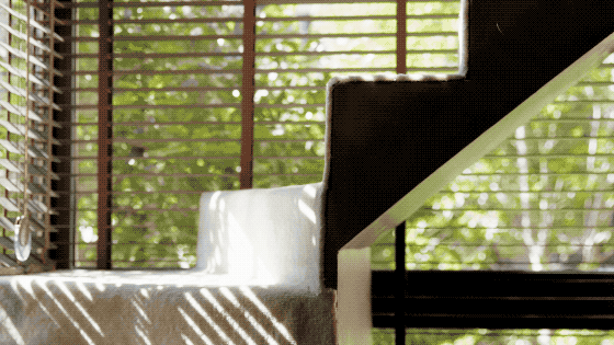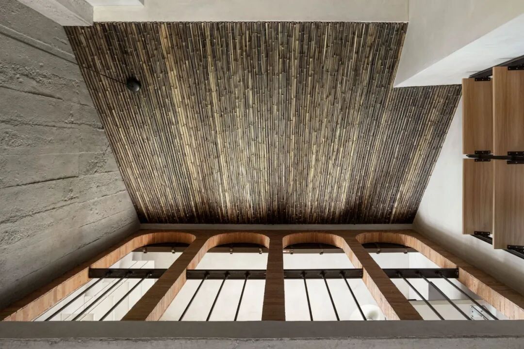我希望在这个空间可以营造出围合感,楼梯选择了现浇的钢筋结合水泥的方式,上面铺了一层薄薄的灰色地毯,踩上去也不会有噪音。