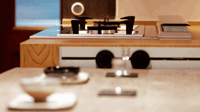 向左转才是餐厨空间。因为偶尔父母也会来住,做做饭。我利用台盆上30公分的进深,做了一个台上柜,选择了升降的卷闸门,微波炉、面包机、瓶瓶罐罐都在这里存放。
